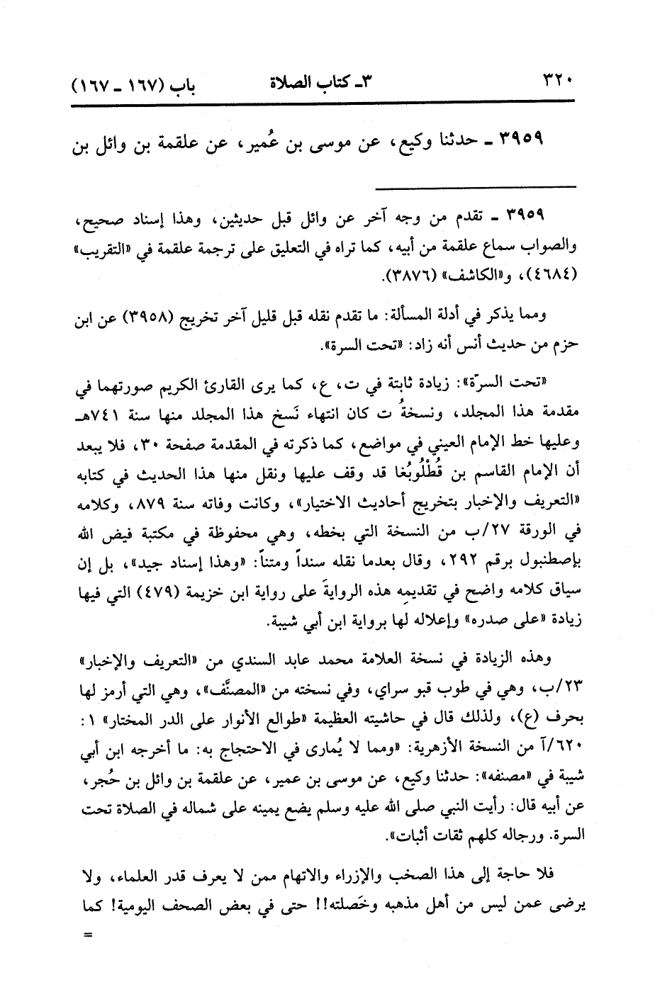 3959- حَدَّثَنَا وَكِيعٌ ، عَنْ مُوسَى بْنِ عُمَيْرٍ ، عَنْ عَلْقَمَةَ بْنِ وَائِلِ بْنِ حُجْرٍ ، عَنْ أَبِيهِ ، قَالَ : رَأَيْتُ النَّبِيَّ صَلَّى الله عَلَيْهِ وَسَلَّمَ وَضَعَ يَمِينَهُ عَلَى شِمَالِهِ فِي الصَّلاَةِ تَحْتَ السُّرَّةِ. (1/390).