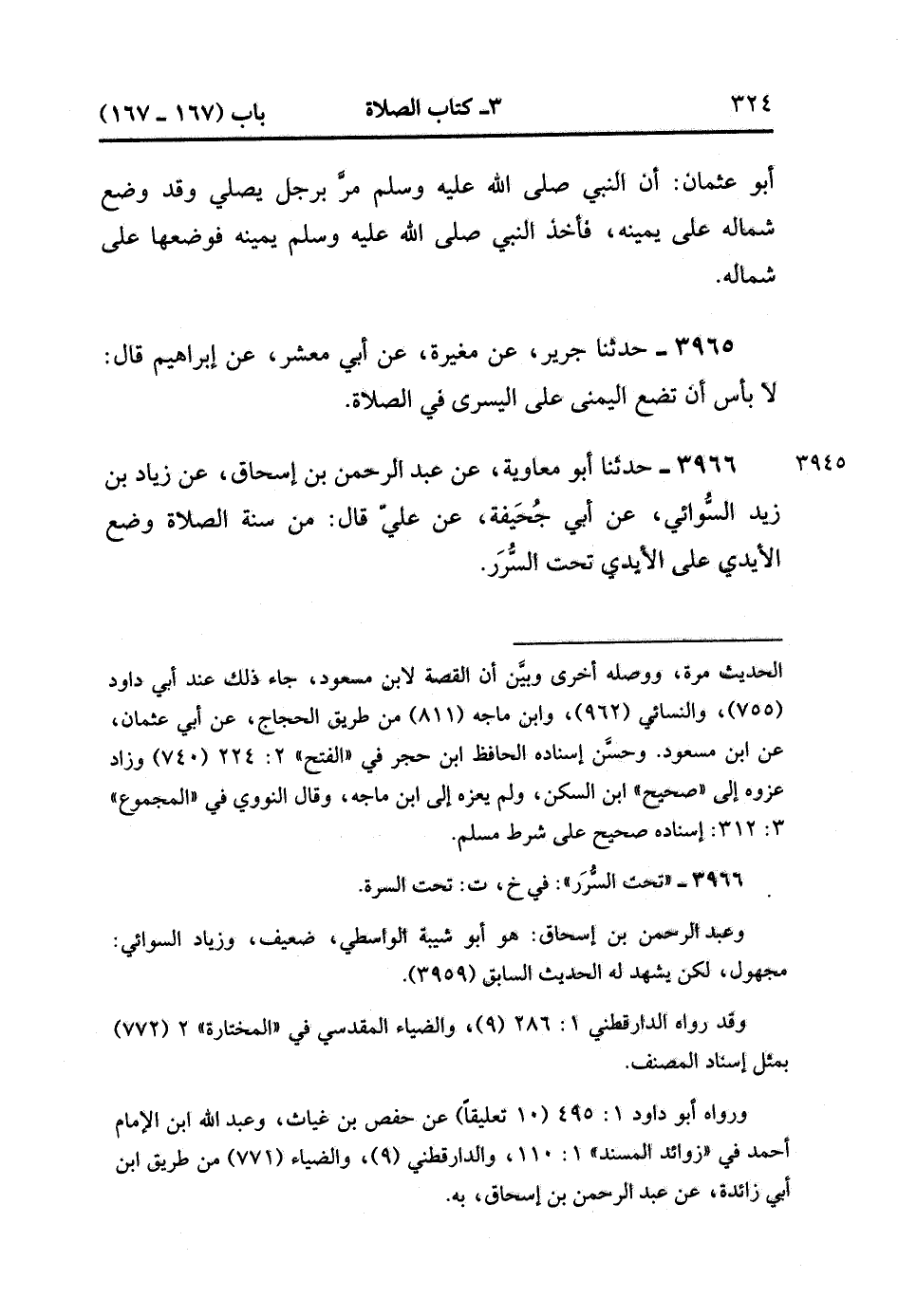 3966- حَدَّثَنَا أَبُو مُعَاوِيَةَ ، عَنْ عَبْدِ الرَّحْمَنِ بْنِ إِسْحَاقَ ، عَنْ زِيَادِ بْنِ زَيْدٍ السُّوَائِيِّ ، عَنْ أَبِي جُحَيْفَةَ ، عَنْ عَلِيٍّ ، قَالَ : مِنْ سُنَّةِ الصَّلاَةِ وَضْعُ الأَيْدِي عَلَى الأَيْدِي تَحْتَ السُّرَرِ. (1/391).