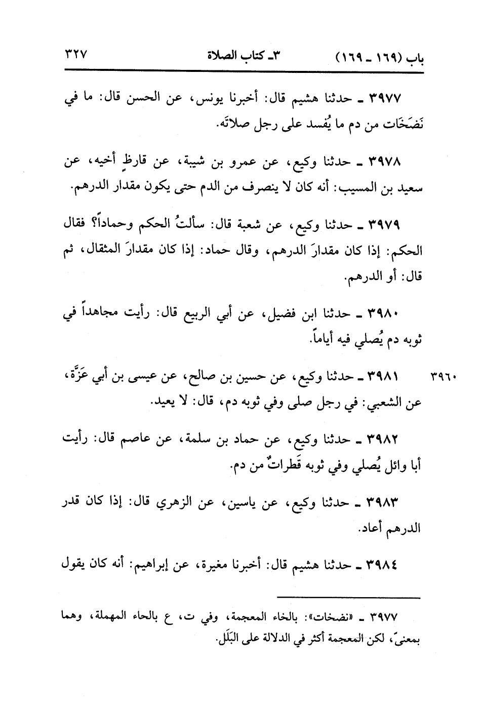 3977- حَدَّثَنَا هُشَيْمٌ ، قَالَ : أَخْبَرَنَا يُونُسُ ، عَنِ الْحَسَنِ ، قَالَ : مَا فِي نَضَخَاتٍ مِنْ دَمٍ مَا يُفْسِدُ عَلَى رَجُلٍ صَلاَتَهُ.