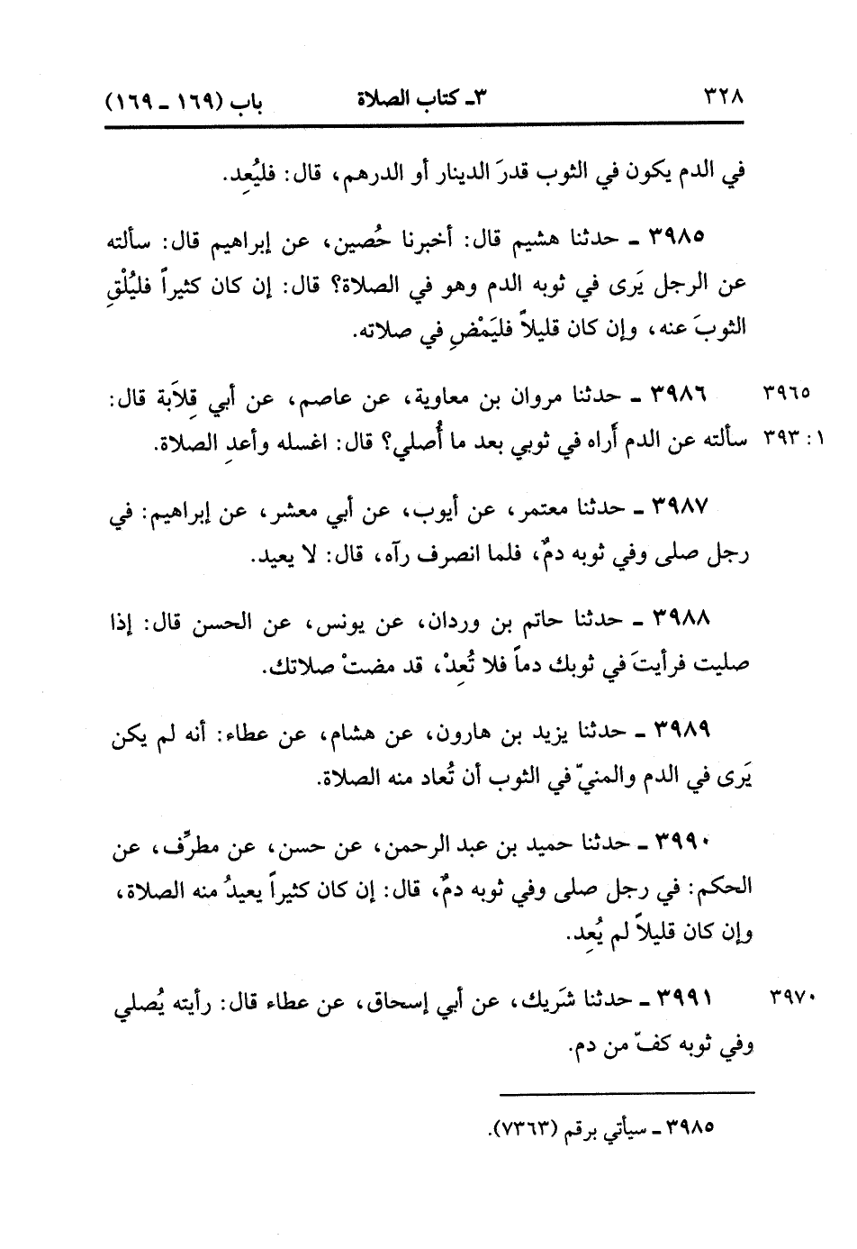 3991- حَدَّثَنَا شَرِيكٌ ، عَنْ أَبِي إِسْحَاقَ ، عَنْ عَطَاءٍ ، قَالَ : رَأَيْتُهُ يُصَلِّي وَفِي ثَوْبِهِ كَفٌّ مِنْ دَمٍ. (1/393).
