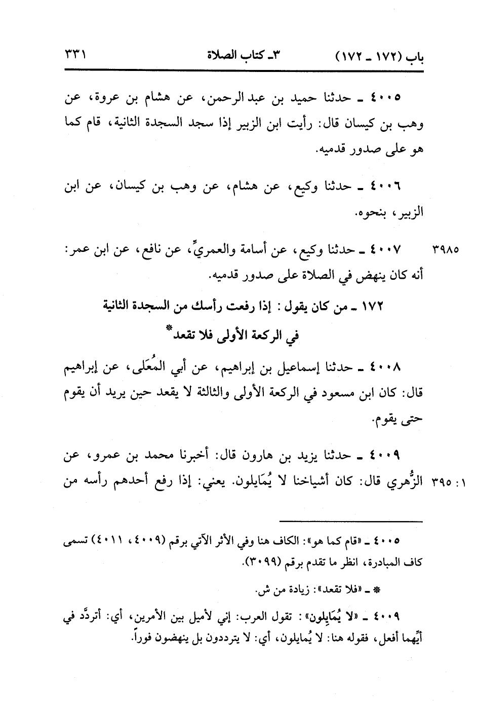 4005- حَدَّثَنَا حُمَيْدُ بْنُ عَبْدِ الرَّحْمَنِ ، عَنْ هِشَامِ بْنِ عُرْوَةَ ، عَنْ وَهْبِ بْنِ كَيْسَانَ ، قَالَ : رَأَيْتُ ابْنَ الزُّبَيْرِ إذَا سَجَدَ السَّجْدَةَ الثَّانِيَةَ قَامَ كَمَا هُوَ عَلَى صُدُورِ قَدَمَيْهِ.