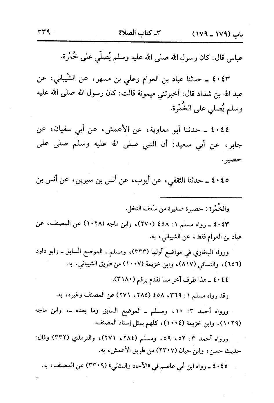 4044- حَدَّثَنَا أَبُو مُعَاوِيَةَ ، عَنِ الأَعْمَشِ ، عَنْ أَبِي سُفْيَانَ ، عَنْ جَابِرٍ ، عَنْ أَبِي سَعِيدٍ : أَنَّ النَّبِيَّ صَلَّى الله عَلَيْهِ وَسَلَّمَ صَلَّى عَلَى حَصِيرٍ. (1/398).