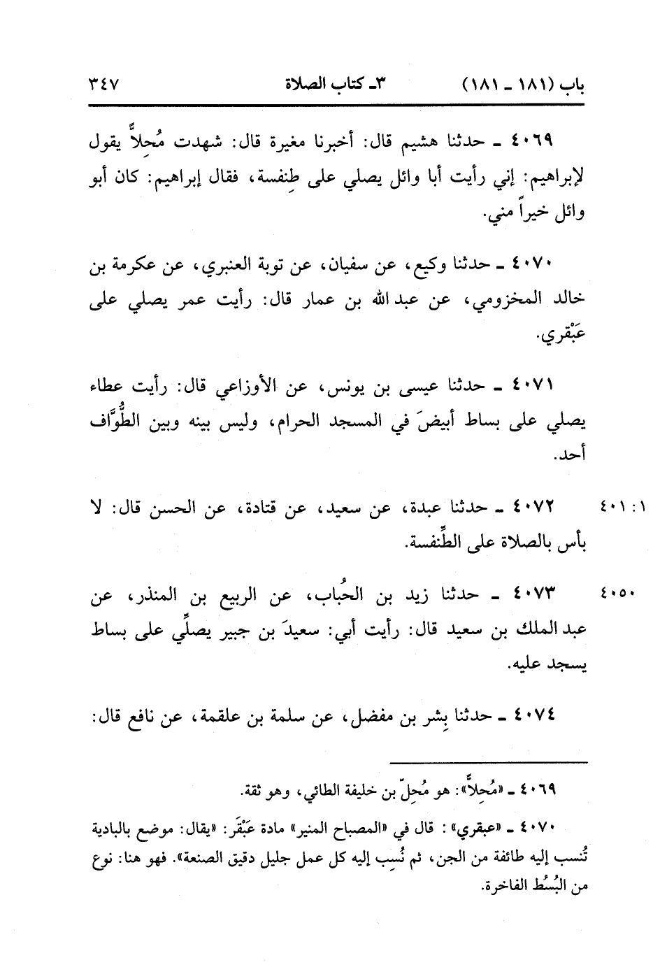 4069- حَدَّثَنَا هُشَيْمٌ ، قَالَ : أَخْبَرَنَا مُغِيرَةُ ، قَالَ : شَهِدْتُ مُحِلاًّ يَقُولُ لإِبْرَاهِيمَ : إنِّي رَأَيْت أَبَا وَائِلٍ يُصَلِّي عَلَى طِنْفِسَةٍ ، فَقَالَ إبْرَاهِيمُ : كَانَ أَبُو وَائِلٍ خَيْرًا مِنِّي.