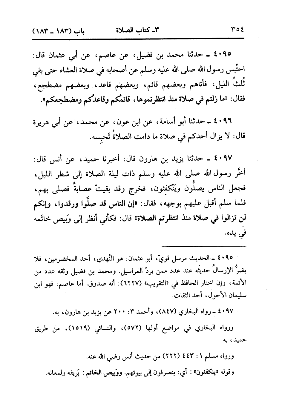 4095- حَدَّثَنَا مُحَمَّدُ بْنُ فُضَيْلٍ ، عَنْ عَاصِمٍ ، عَنْ أَبِي عُثْمَانَ ، قَالَ : احْتُبسَ رَسُولُ اللهِ صَلَّى الله عَلَيْهِ وَسَلَّمَ عَنْ أَصْحَابِهِ فِي صَلاَةِ الْعِشَاءِ ، حَتَّى بَقِيَ ثُلُثُ اللَّيْلِ ، فَأَتَاهُمْ وَبَعْضُهُمْ قَائِمٌ ، وَبَعْضُهُمْ قَاعِدٌ ، وَبَعْضُهُمْ مُضْطَجِعٌ ، فَقَالَ : مَا زِلْتُمْ فِي صَلاَةٍ مُنْذُ انْتَظَرْتُمُوهَا ، قَائِمُكُمْ وَقَاعِدُكُمْ وَمُضْطَجِعُكُمْ.