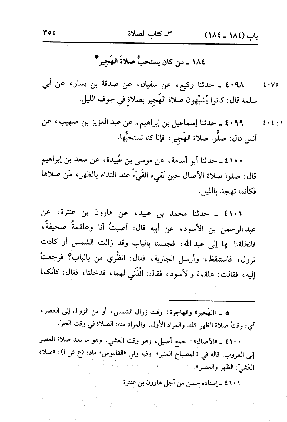 4101- حَدَّثَنَا مُحَمَّدُ بْنُ عُبَيْدٍ ، عَنْ هَارُونَ بْنِ عَنْتَرَةَ ، عَنْ عَبْدِ الرَّحْمَنِ بْنِ الأَسْوَدِ ، عَنْ أَبِيهِ ، قَالَ : أَصَبْت أَنَا وَعَلْقَمَةُ صَحِيفَةً ، فَانْطَلَقْنَا بِهَا إلَى عَبْدِ اللهِ ، فَجَلَسْنَا بِالْبَابِ وَقَدْ زَالَتِ الشَّمْسُ ، أَوْ كَادَتْ تَزُولُ ، فَاسْتَيْقَظَ وَأَرْسَلَ الْجَارِيَةَ ، فَقَالَ : انْظُرِي مَنْ بِالْبَابِ ، فَرَجَعَتْ إلَيْهِ ، فَقَالَتْ : عَلْقَمَةُ وَالأَسْوَدُ ، فَقَال : ائْذَنِي لَهُمَا ، فَدَخَلْنَا ، فَقَالَ : كَأَنَّكُمَا قَدْ أَطَلْتُمَا الْجُلُوسَ بِالْبَابِ ؟ قَالاَ : أَجَلْ ، قَالَ : فَمَا مَنَعُكُمَا أَنْ تَسْتَأْذِنَا ؟ قَالاَ : خَشِينَا أَنْ تَكُونَ نَائِمًا ، قَالَ : مَا كُنْت أُحِبُّ أَنْ تَظُنُّوا بِي هَذِا ، إنَّ هَذِهِ سَاعَةٌ كُنَّا نُشَبِّهُهَا بِصَلاَةِ اللَّيْلِ. (1/404).