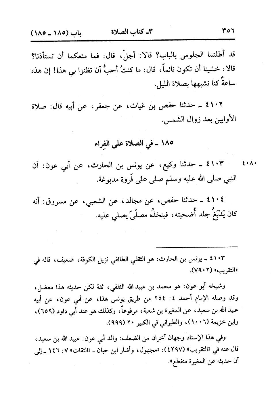 4103- حَدَّثَنَا وَكِيعٌ ، عَنْ يُونُسَ بْنِ الْحَارِثِ ، عَنْ أَبِي عَوْنٍ : أَنَّ النَّبِيَّ صَلَّى الله عَلَيْهِ وَسَلَّمَ صَلَّى عَلَى فَرْوَةٍ مَدْبُوغَةٍ.