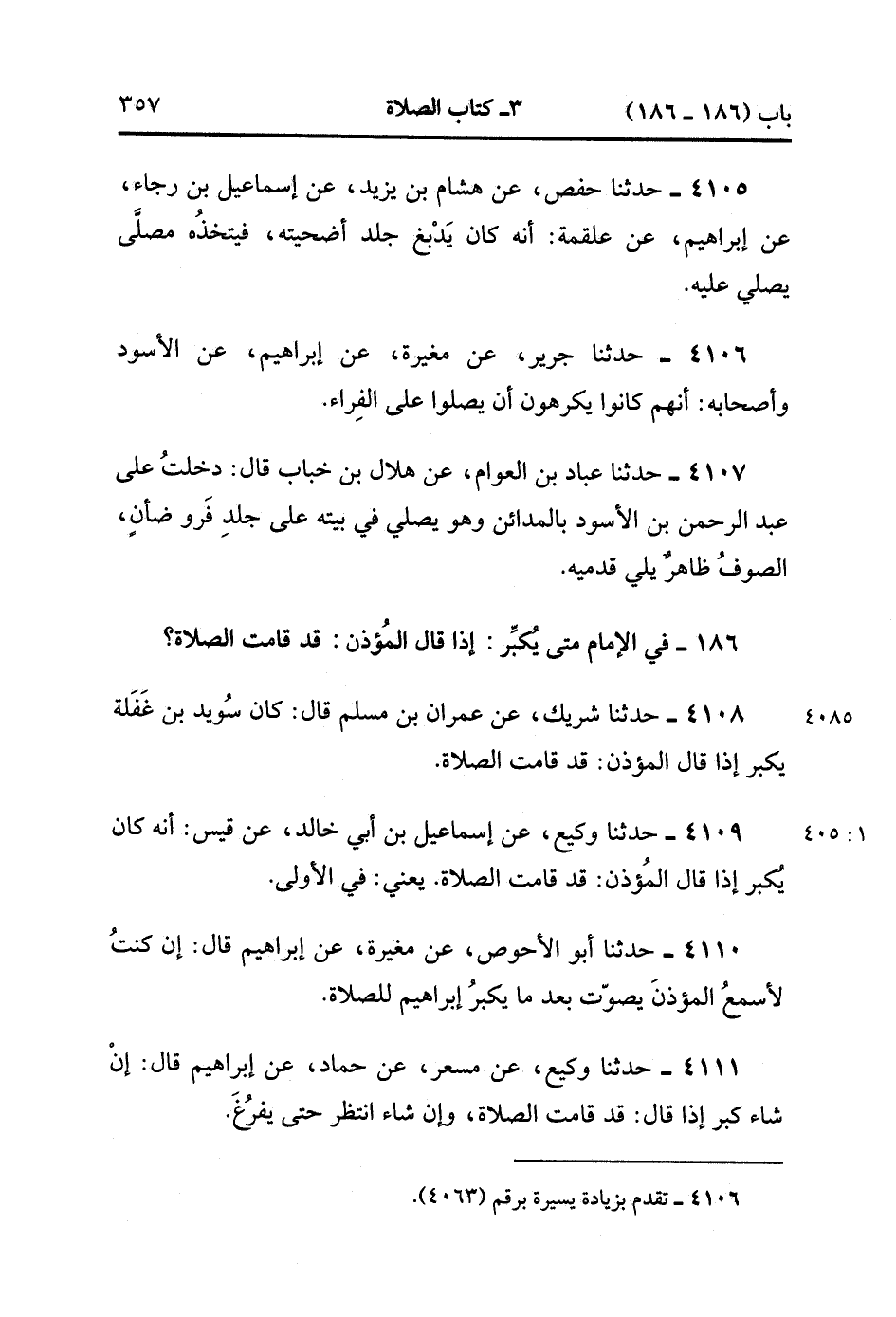 4110- حَدَّثَنَا أَبُو الأَحْوَصِِ ، عَنْ مُغِيرَةَ ، عَنْ إبْرَاهِيمَ ، قَالَ : إِنْ كُنْت لأَسْمَعُ الْمُؤَذِّنَ يُصَوِّتُ بَعْدَ مَا يُكَبِّرُ إبْرَاهِيمُ لِلصَّلاَةِ.
