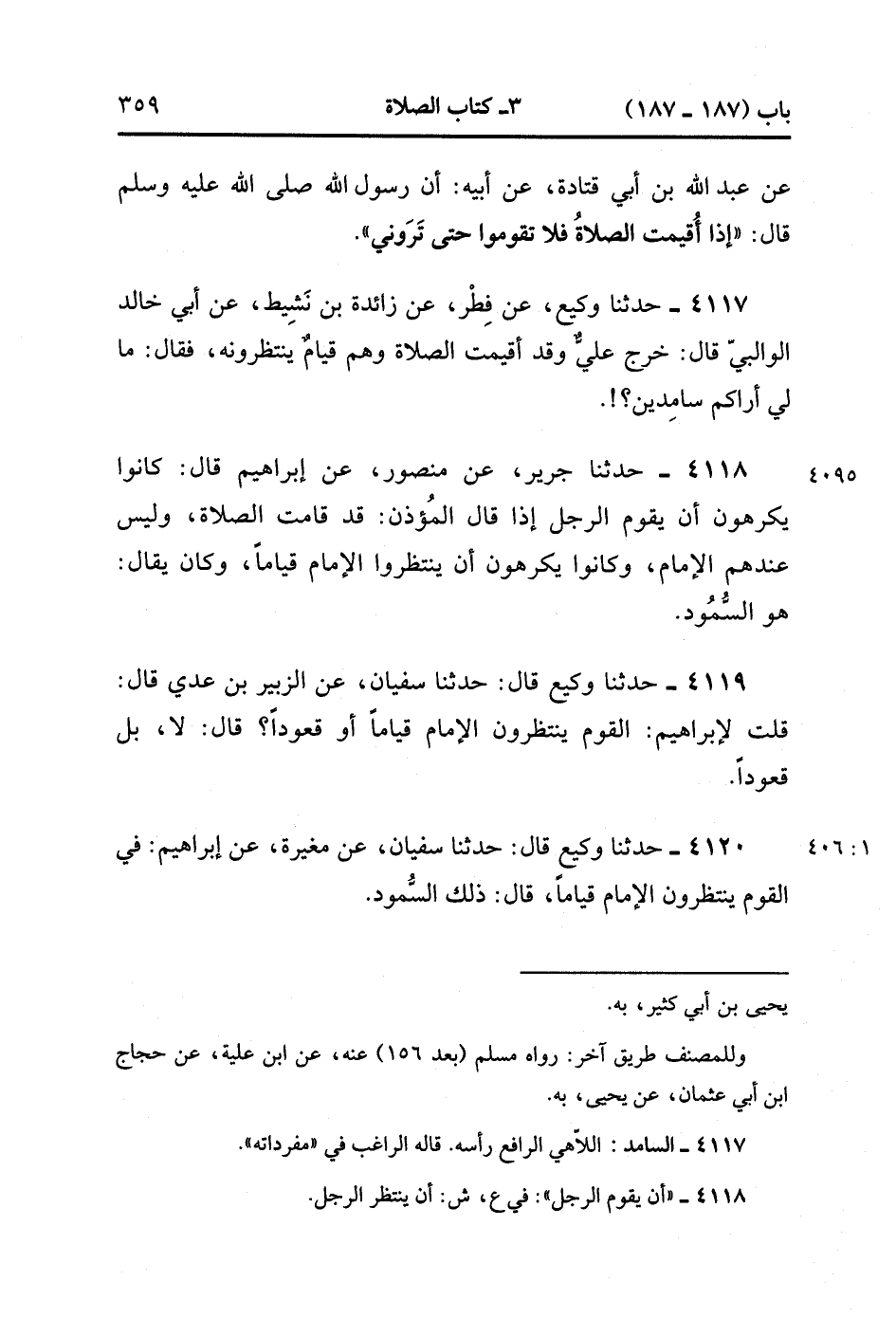 4120- حَدَّثَنَا وَكِيعٌ , قَالَ : حدَّثَنَا سُفْيَانُ ، عَنْ مُغِيرَةَ ، عَنْ إبْرَاهِيمَ ؛ فِي الْقَوْمِ يَنْتَظِرُونَ الإِمَامَ قِيَامًا ، قَالَ : ذَلِكَ السُّمُودُ. (1/406).
