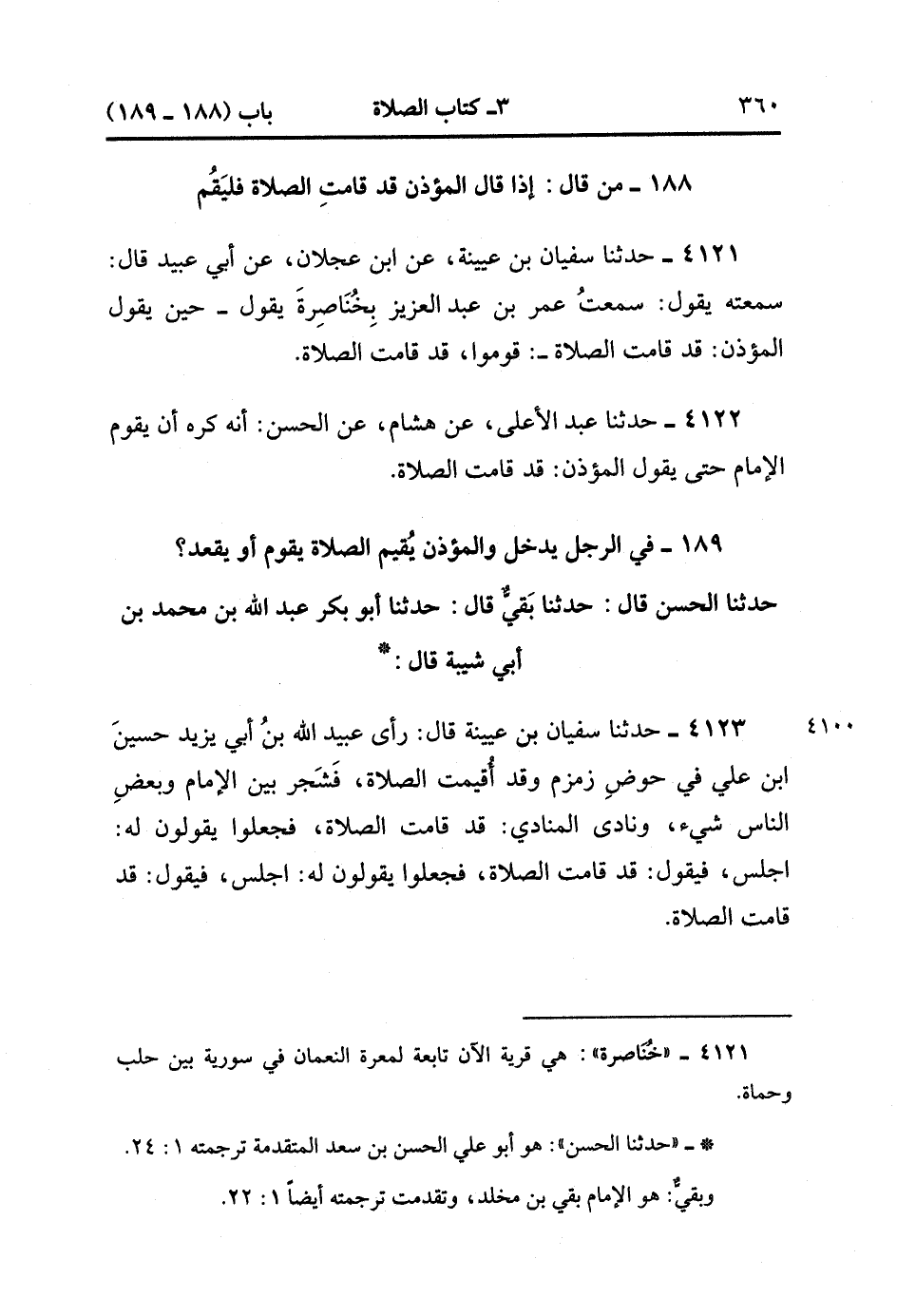 4123- حَدَّثَنَا سُفْيَانُ بْنُ عُيَيْنَةَ ، قَالَ : رَأَى عُبَيْدُ اللهِ بْنُ أَبِي يَزِيدَ حُسَيْنَ بْنَ عَلِيٍّ فِي حَوْضِ زَمْزَمَ ، وَقَدْ أُقِيمَتِ الصَّلاَةُ ، فَشَجر بَيْنَ الإِمَامِ وَبَعْضِ النَّاسِ شَيْءٌ ، وَنَادَى الْمُنَادِي : قَدْ قَامَتِ الصَّلاَةُ ، فَجَعَلُوا يَقُولُونَ لَهُ : اجْلِسْ ، فَيَقُولُ : قَدْ قَامَتِ الصَّلاَةُ ، فَجَعَلُوا يَقُولُونَ لَهُ : اجْلِسْ ، فَيَقُولُ : قَدْ قَامَتِ الصَّلاَةُ. (1/406)