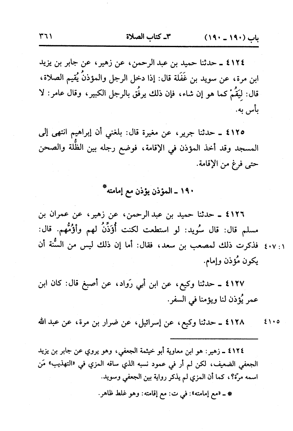 4126- حَدَّثَنَا حُمَيْدُ بْنُ عَبْدِ الرَّحْمَنِ ، عَنْ زُهَيْرٍ ، عَنْ عِمْرَانَ بْنِ مُسْلِمٍ ، قَالَ : قَالَ سُوَيْد : لَوِ اسْتَطَعْتُ لَكُنْت أُؤَذِّنُ لَهُمْ وَأَؤُمُّهُمْ ، قَالَ : فَذَكَرْتُ ذَلِكَ لِمُصْعَبِ بْنِ سَعْدٍ ، فَقَالَ : أَمَا إنَّ ذَلِكَ لَيْسَ مِنَ السُّنَّةِ أَنْ يَكُونَ مُؤَذِّن وَإِمَام. (1/406)