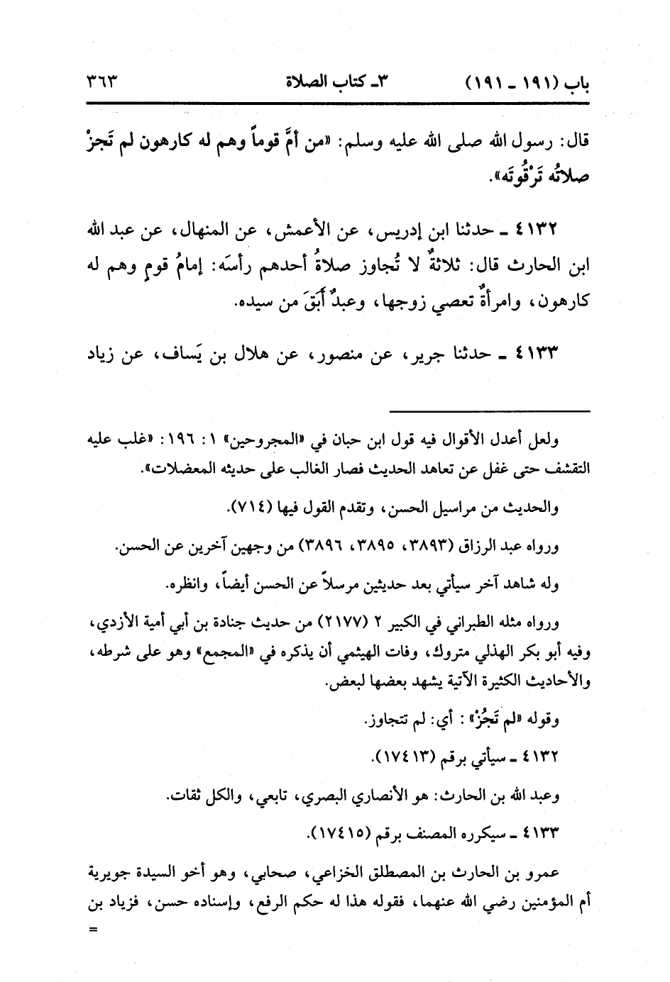 4132- حَدَّثَنَا ابْنُ إدْرِيسَ ، عَنِ الأَعْمَشِ ، عَنِ الْمِنْهَالِ ، عَنْ عَبْدِ اللهِ بْنِ الْحَارِثِ ، قَالَ : ثَلاَثَةٌ لا تُجَاوِزُ صَلاَةُ أَحَدِهِمْ رَأْسَهُ : إمَامُ قَوْمٍ وَهُمْ لَهُ كَارِهُونَ ، وَامْرَأَةٌ تَعْصِي زَوْجَهَا ، وَعَبْدٌ أَبَقَ مِنْ سَيِّدِهِ. (1/407).