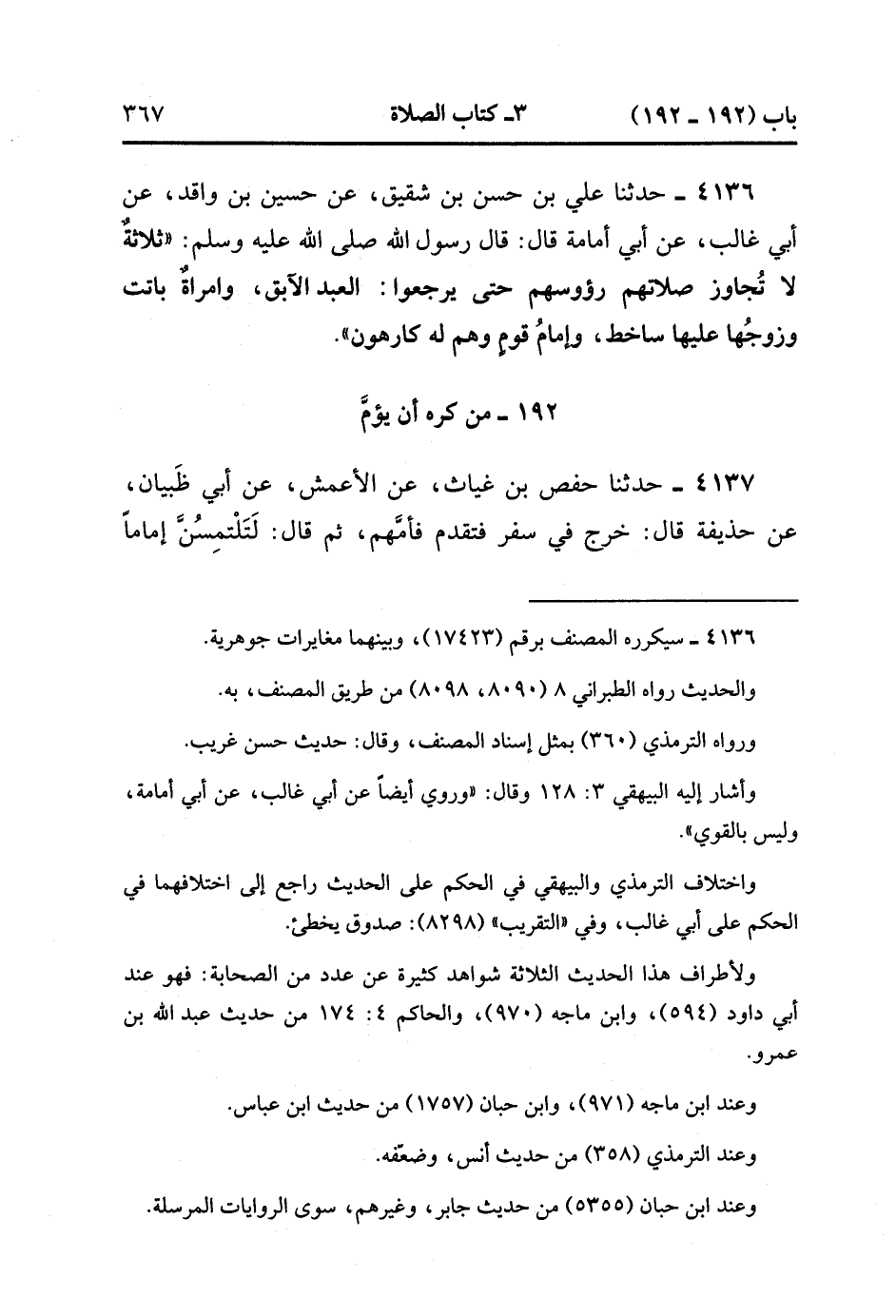 4136- حَدَّثَنَا عَلِيُّ بْنُ حَسَنِ بْنِ شَقِيقٍ ، عَنْ حُسَيْنِ بْنِ وَاقِدٍ ، عَنْ أَبِي غَالِبٍ ، عَنْ أَبِي أُمَامَةَ ، قَالَ : قَالَ رَسُولُ اللهِ صَلَّى الله عَلَيْهِ وَسَلَّمَ : ثَلاَثَةٌ لا تُجَاوِزُ صَلاَتُهُمْ رُؤُوسَهُمْ حَتَّى يَرْجِعُوا : الْعَبْدُ الآبِقُ ، وَامْرَأَةٌ بَاتَتْ وَزَوْجُهَا عَلَيْهَا سَاخِطٌ ، وَإِمَامُ قَوْمٍ وَهُمْ لَهُ كَارِهُونَ.