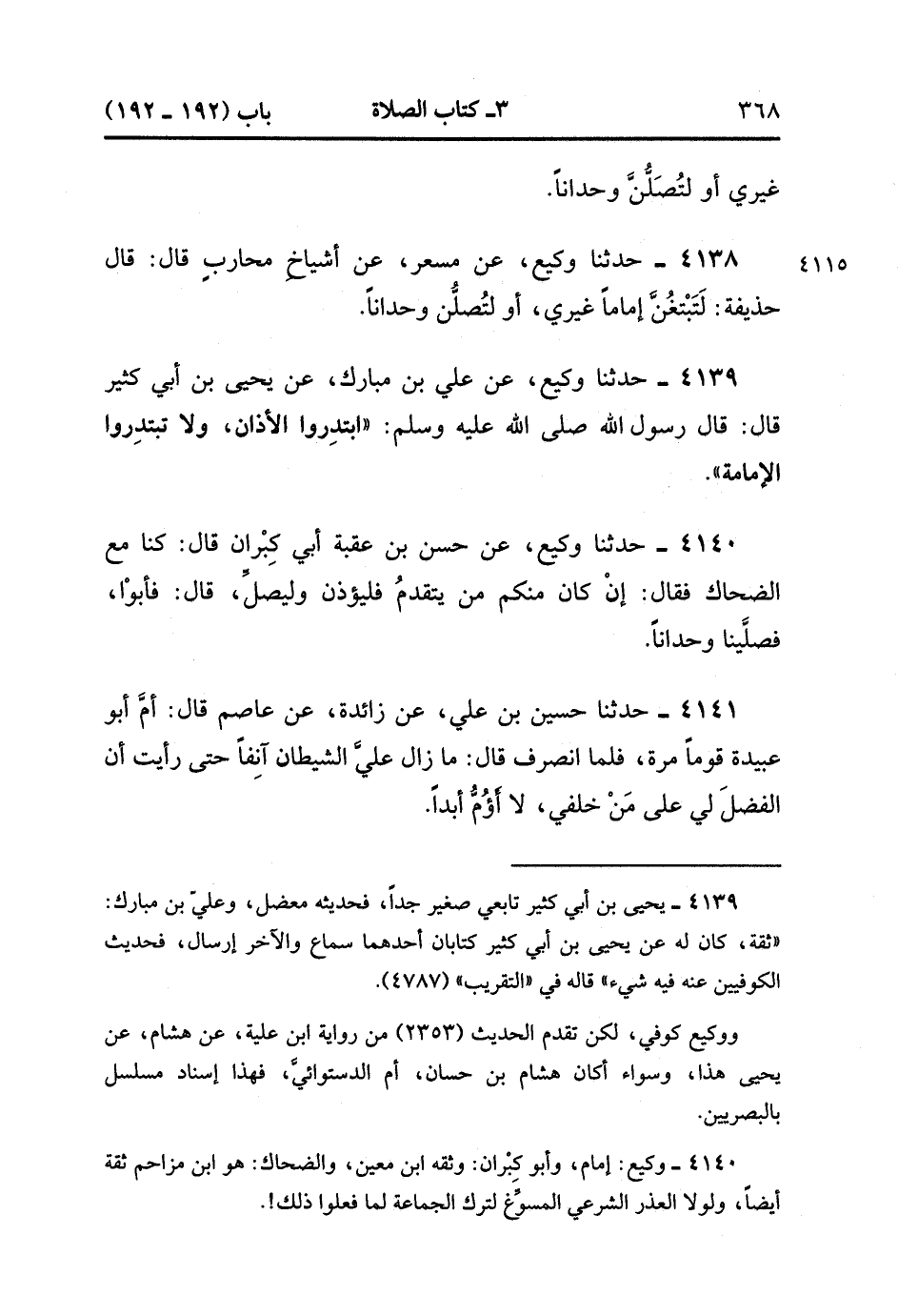 4138- حَدَّثَنَا وَكِيعٌ ، عَنْ مِسْعَرٍ ، عَنْ أَشْيَاخِ مُحَارِبٍ ، قَالَ : قَالَ حُذَيْفَةُ : لَتَبْتَغُنَّ إمَامًا غَيْرِي أَوْ لَتُصَلُّنَّ وُحْدَانًا.