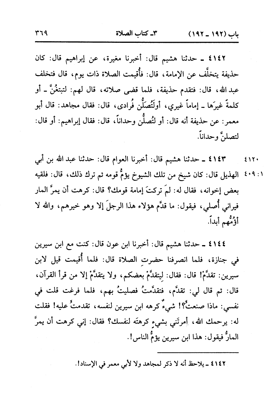 4142- حَدَّثَنَا هُشَيْمٌ ، قَالَ : أَخْبَرَنَا مُغِيرَةُ ، عَنْ إبْرَاهِيمَ ، قَالَ : كَانَ حُذَيْفَةُ يَتَخَلَّفُ عَنِ الإِمَامَةِ ، قَالَ : فَأُقِيمَتِ الصَّلاَةُ ذَاتَ يَوْمٍ ، قَالَ : فَتَخَلَّفَ عَبْدُ اللهِ ، قَالَ : فَتَقَدَّمَ حُذَيْفَةُ ، فَلَمَّا قَضَى صَلاَتَهُ ، قَالَ لَهُم : لَتَبْتَغُنَّ - أَوْ كَلِمَةً غَيْرَهَا - إمَامًا غَيْرِي ، أَوْ لَتُصَلُّنَّ فُرَادَى. قَالَ : فَقَالَ مُجَاهِدٌ : قَالَ أَبُو مَعْمَرٍ ، عَنْ حُذَيْفَةَ أَنَّهُ قَالَ : أَوْ لَتُصَلُّنَّ وُحْدَانًا ، قَالَ : فَقَالَ إبْرَاهِيمُ : أَوْ قَالَ : لَتُصَلُّنَّ وُحْدَانًا.