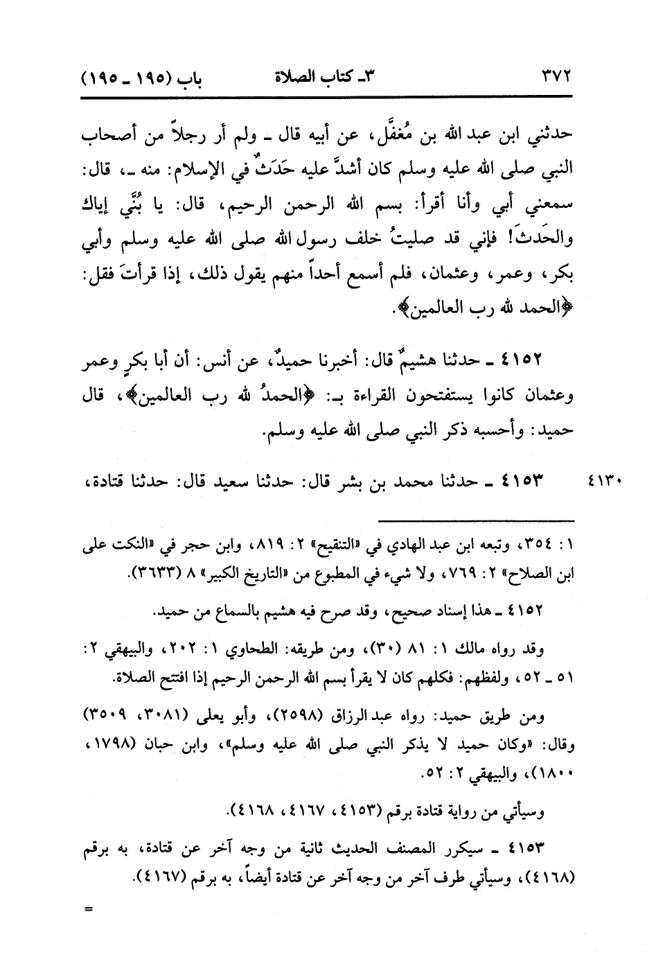 4153- حَدَّثَنَا مُحَمَّدُ بْنُ بِشْرٍ , قَالَ : حدَّثَنَا سَعِيدٌ ، قَالَ : حَدَّثَنَا قَتَادَةُ ، عَنْ أَنَسٍ : أَنَّ رَسُولَ اللهِ صَلَّى الله عَلَيْهِ وَسَلَّمَ وَأَبَا بَكْرٍ وَعُمَرَ وَعُثْمَانَ كَانُوا يَفْتَتِحُونَ الْقِرَاءَةَ بِـ {الْحَمْدُ لِلَّهِ رَبِّ الْعَالَمِينَ}. (1/410).