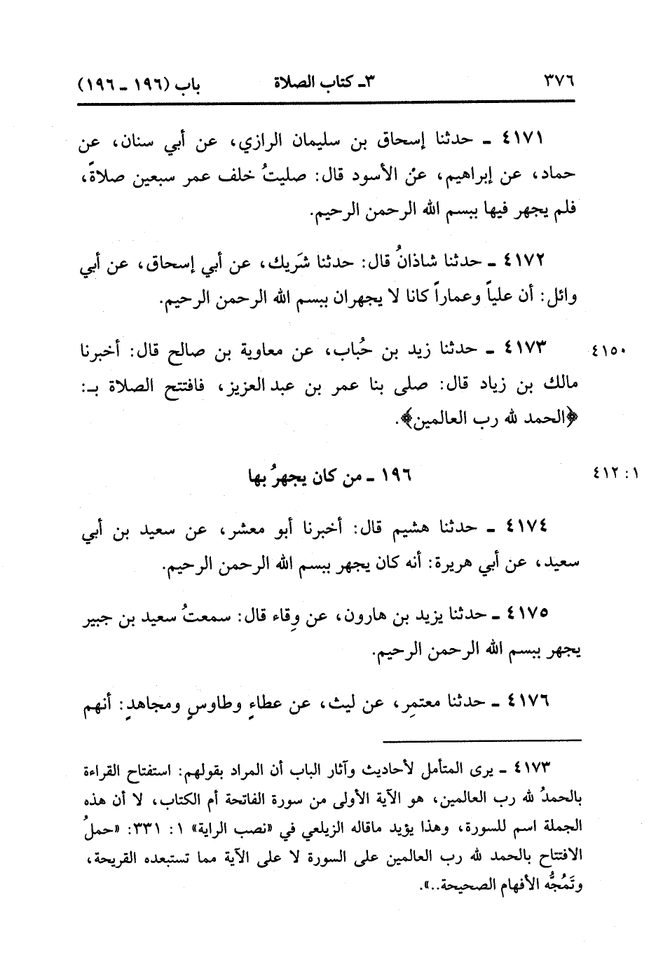 4171- حَدَّثَنَا إِسْحَاقُ بْنُ سُلَيْمَانَ الرَّازِيّ ، عَنْ أَبِي سِنَانٍ ، عَنْ حَمَّادٍ ، عَنْ إبْرَاهِيمَ ، عَنِ الأَسْوَدِ ، قَالَ : صَلَّيْت خَلْفَ عُمَرَ سَبْعِينَ صَلاَةً ، فَلَمْ يَجْهَرْ فِيهَا بِـ {بِسْمِ اللهِ الرَّحْمَنِ الرَّحِيمِ}.