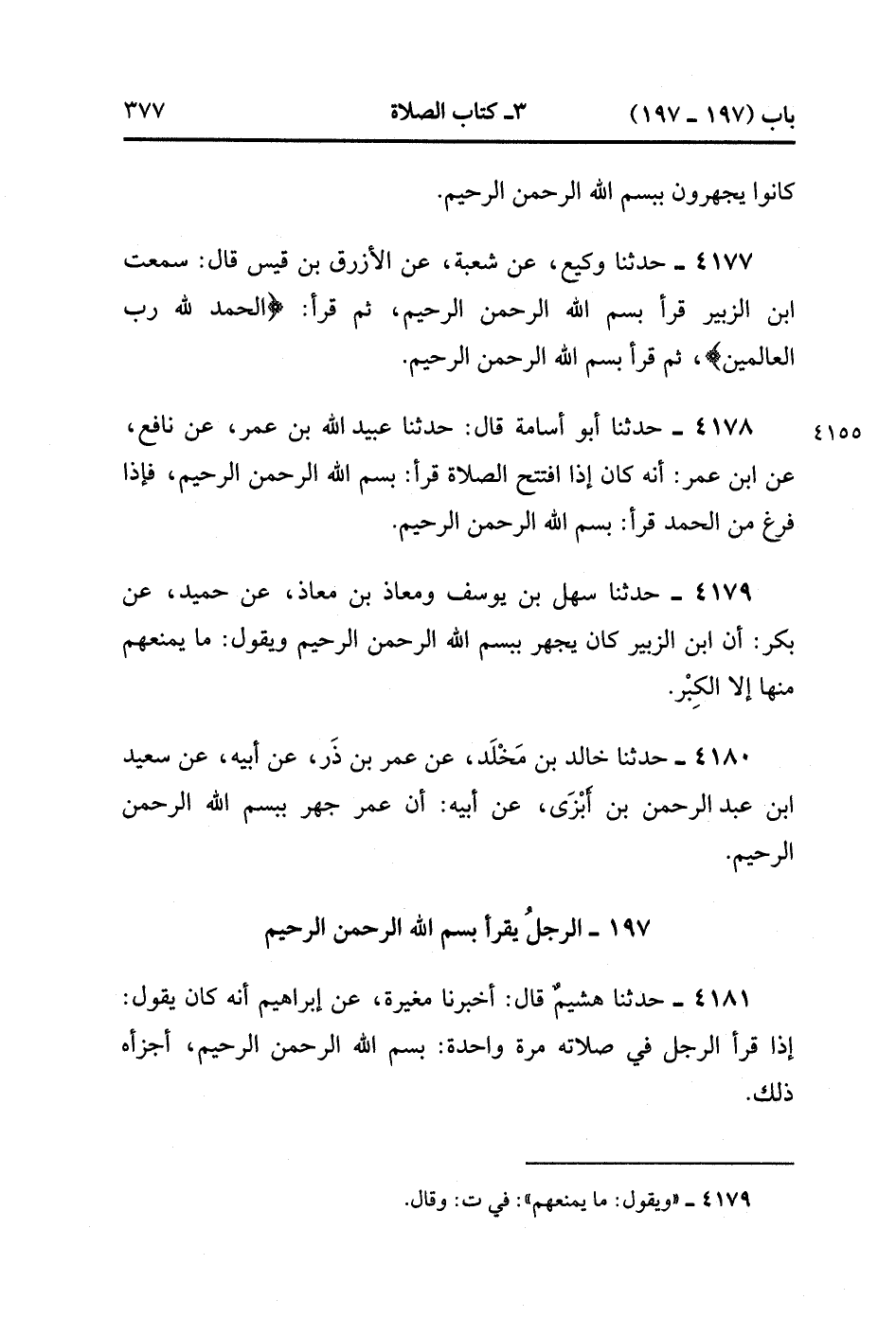 4179- حَدَّثَنَا سَهْلُ بْنُ يُوسُفَ وَمُعَاذُ بْنُ مُعَاذٍ ، عَنْ حُمَيْدٍ ، عَنْ بَكْرٍ : أَنَّ ابْنَ الزُّبَيْرِ كَانَ يَجْهَرُ بِـ {بِسْمِ اللهِ الرَّحْمَنِ الرَّحِيمِ} وَيَقُولُ : مَا يَمْنَعُهُمْ مِنْهَا إِلاَّ الْكِبْرُ.