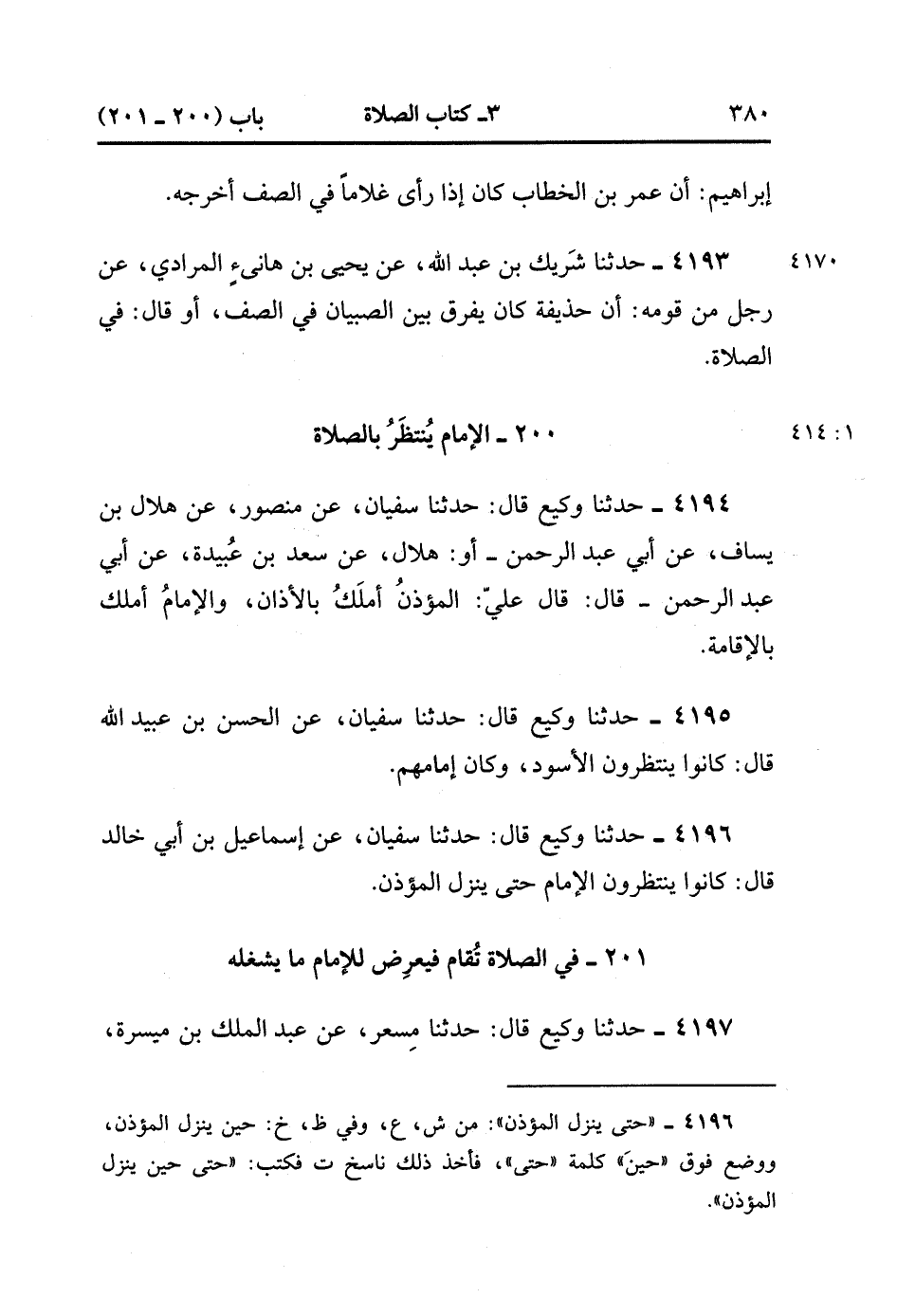 4196- حَدَّثَنَا وَكِيعٌ , قَالَ : حدَّثَنَا سُفْيَانُ ، عَنْ إسْمَاعِيلَ بْنِ أَبِي خَالِدٍ ، قَالَ : كَانُوا يَنْتَظِرُونَ الإِمَامَ حَتَّى يَنْزِلَ الْمُؤَذِّنُ.