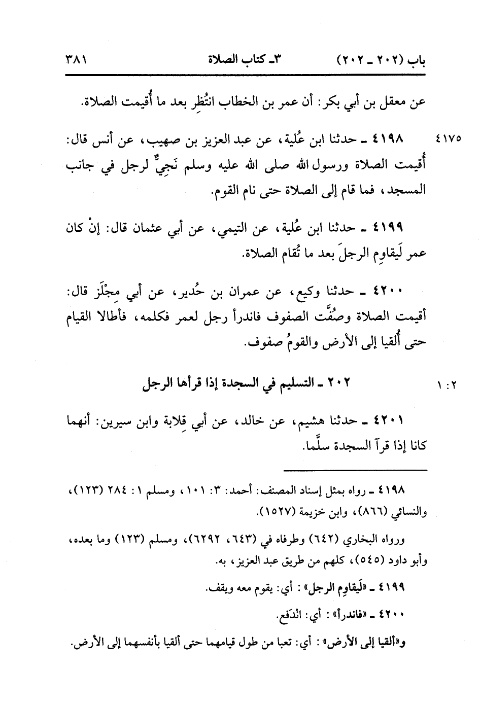 4200- حَدَّثَنَا وَكِيعٌ ، عَنْ عِمْرَانَ بْنِ حُدَيْرٍ ، عَنْ أَبِي مِجْلَزٍ ، قَالَ : أُقِيمَتِ الصَّلاَةُ وَصُفَّتِ الصُّفُوفُ فَانْدَرَأَ رَجُلٌ لِعُمَرَ فَكَلَّمَهُ ، فَأَطَالاَ الْقِيَامَ حَتَّى أُلْقِيَا إِلَى الأَرْضِ وَالْقَوْمُ صُفُوفٌ. (1/414)