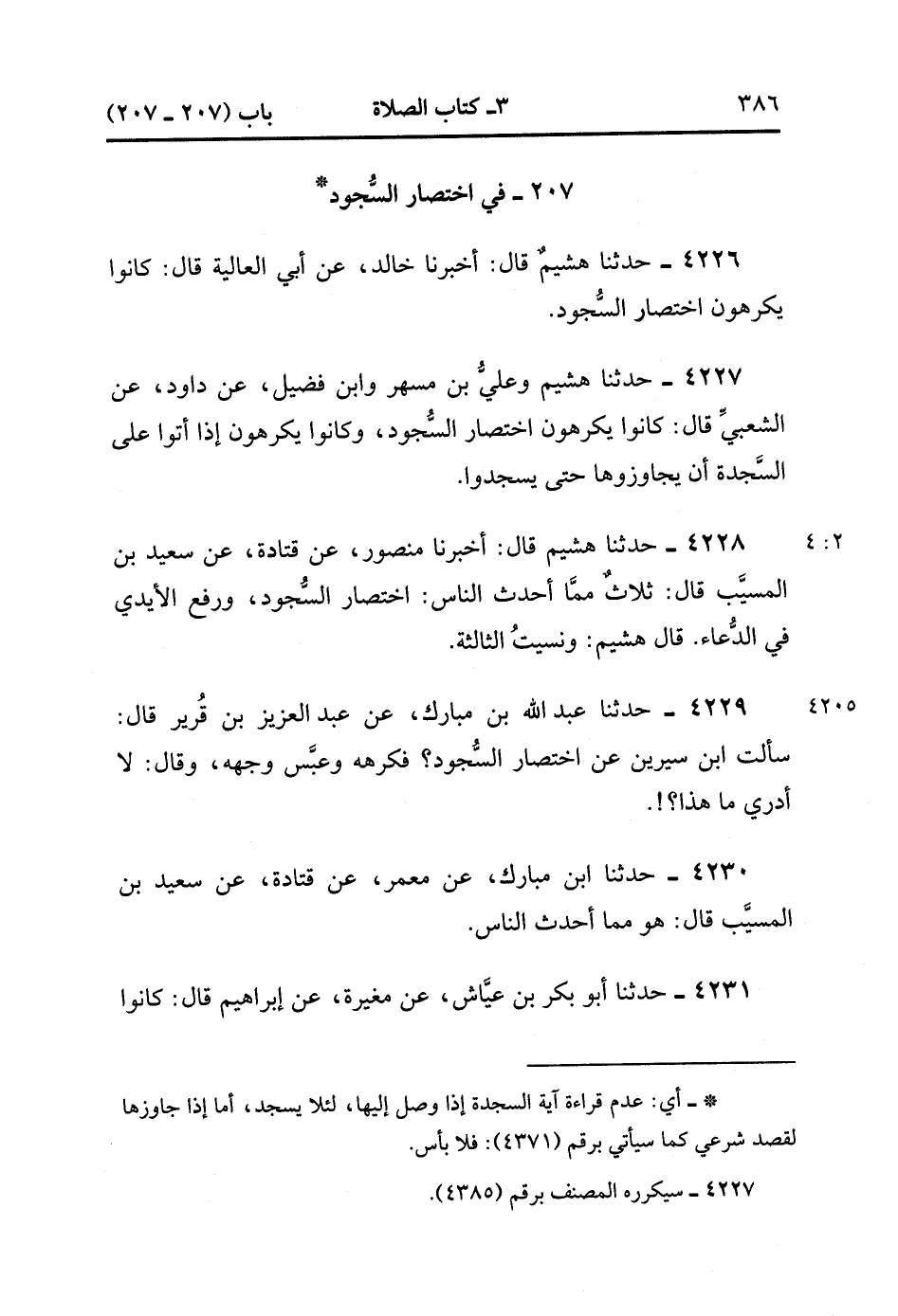 4226- حَدَّثَنَا هُشَيْمٌ ، قَالَ : أَخْبَرَنَا خَالِدٌ ، عَنْ أَبِي الْعَالِيَةِ ، قَالَ : كَانُوا يَكْرَهُونَ اخْتِصَارَ السُّجُودِ.