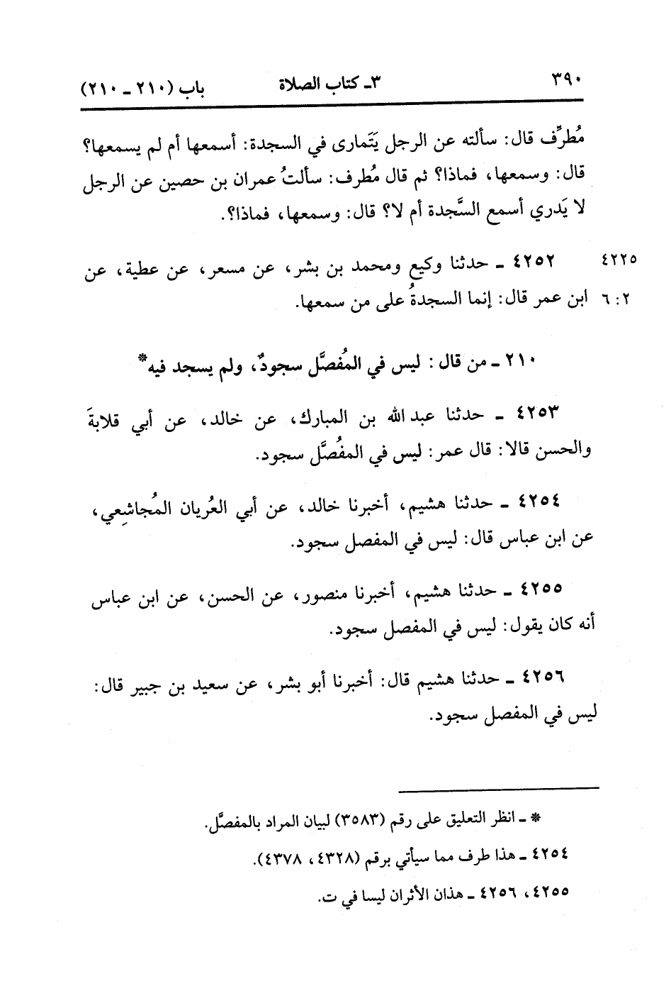 4256- حَدَّثَنَا هُشَيْمُ , قَالَ : أَخْبَرَنَا أَبُو بِشْرٍ ، عَنْ سَعِيدِ بْنِ جُبَيْرٍ ، قَالَ : لَيْسَ فِي الْمُفَصَّلِ سُجُود. (2/6).