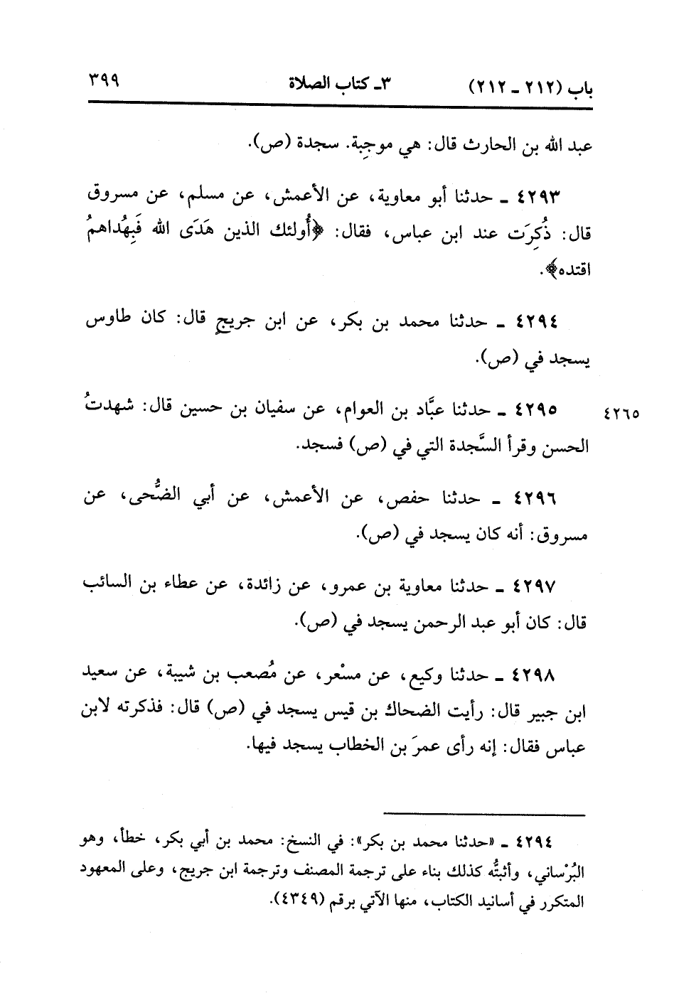 4294- حَدَّثَنَا مُحَمَّدُ بْنُ بَكْرٍ ، عَنِ ابْنِ جُرَيْجٍ ، قَالَ : كَانَ طَاوُوس يَسْجُدُ فِي (ص).