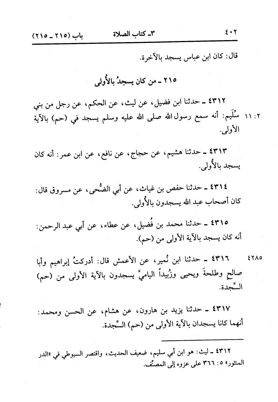 4316- حَدَّثَنَا ابْنُ نُمَيْرٍ ، عَنِ الأَعْمَشِ ، قَالَ : أَدْرَكْتُ إبْرَاهِيمَ وَأَبَا صَالِحٍ وَطَلْحَةَ وَيَحْيَى وَزُبَيْدَاً الْيَامِيَّ يَسْجُدُونَ بِالآيَةِ الأُولَى مِنْ {حم} السَّجْدَةِ.