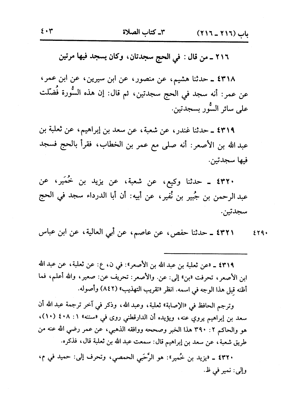 4319- حَدَّثَنَا غُنْدَرٌ ، عَنْ شُعْبَةَ ، عَنْ سَعد بْنِ إِبْرَاهِيمَ ، عَنْ ثَعْلَبَةَ بْنِ عَبْدِ اللهِ بْنِ الأَصْعَرِ : أَنَّهُ صَلَّى مَعَ عُمَرَ بْنِ الْخَطَّابِ فَقَرَأَ بِالْحَجِّ فَسَجَدَ فِيهَا سَجْدَتَيْنِ.
