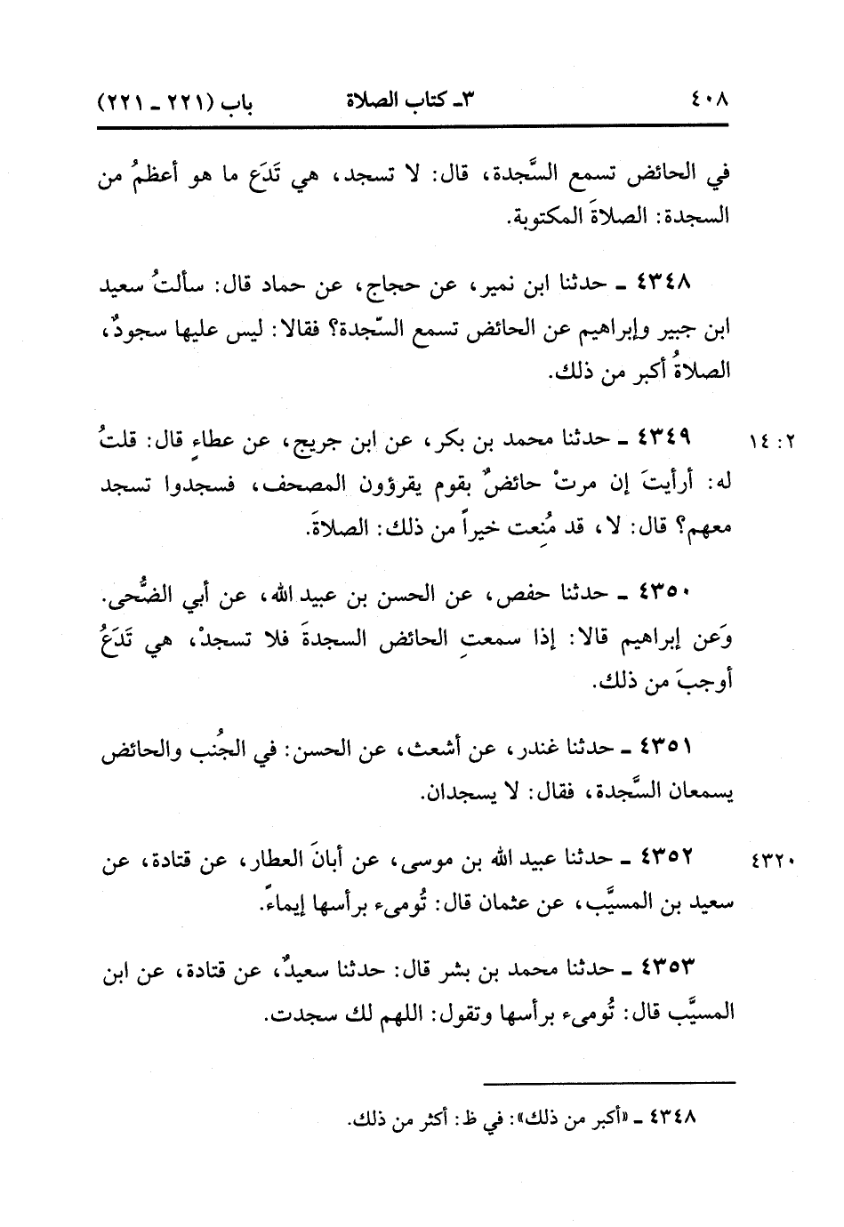 4348- حَدَّثَنَا ابْنُ نُمَيْرٍ ، عَنْ حَجَّاجٍ ، عَنْ حَمَّادٍ ، قَالَ : سَأَلْتُ سَعِيدَ بْنَ جُبَيْرٍ وَإِبْرَاهِيمَ عَنِ الْحَائِضِ تَسْمَعُ السَّجْدَةَ ؟ فَقَالاَ : لَيْسَ عَلَيْهَا سُجُودٌ ، الصَّلاَة أَكْبَرُ مِنْ ذَلِكَ. (2/13)