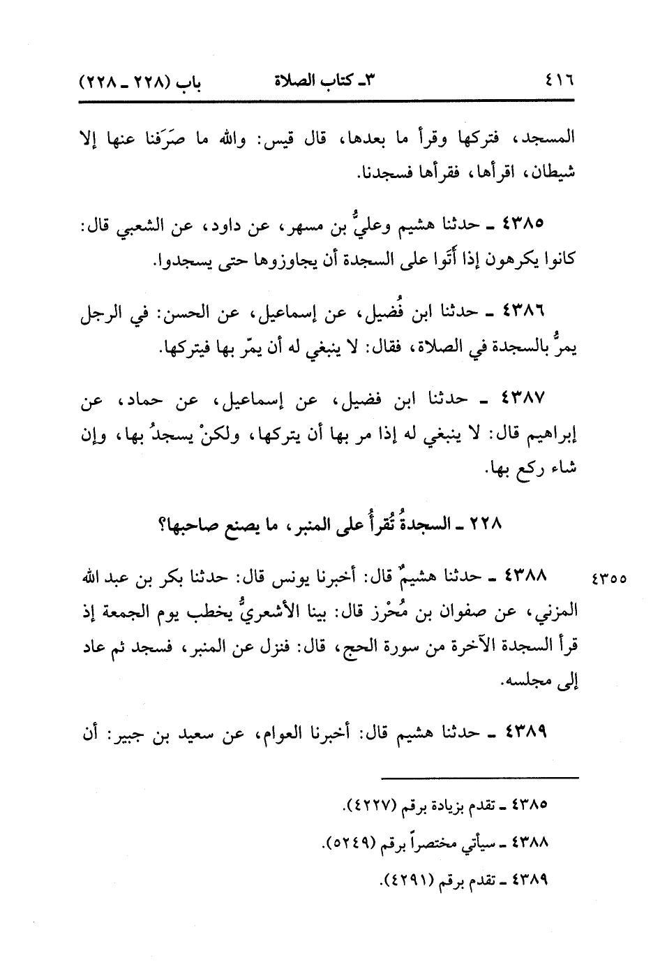 4385- حَدَّثَنَا هُشَيْمٌ وَعَلِيُّ بْنُ مُسْهِرٍ ، عَنْ دَاوُدَ ، عَنِ الشَّعْبِيِّ ، قَالَ : كَانُوا يَكْرَهُونَ إذَا أَتَوْا عَلَى السَّجْدَةِ أَنْ يُجَاوِزُوهَا حَتَّى يَسْجُدُوا.