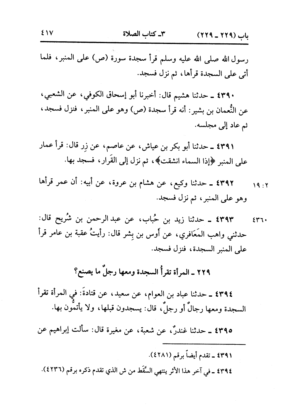 4390- حَدَّثَنَا هُشَيْمٌ ، قَالَ : أَخْبَرَنَا أَبُو إِسْحَاقَ الْكُوفِي ، عَنِ الشَّعْبِيِّ ، عَنِ النُّعْمَانِ بْنِ بَشِيرٍ : أَنَّهُ قَرَأَ سَجْدَةَ (ص) وَهُوَ عَلَى الْمِنْبَرِ ، فَنَزَلَ فَسَجَدَ ، ثُمَّ عَادَ إلَى مَجْلِسِهِ.
