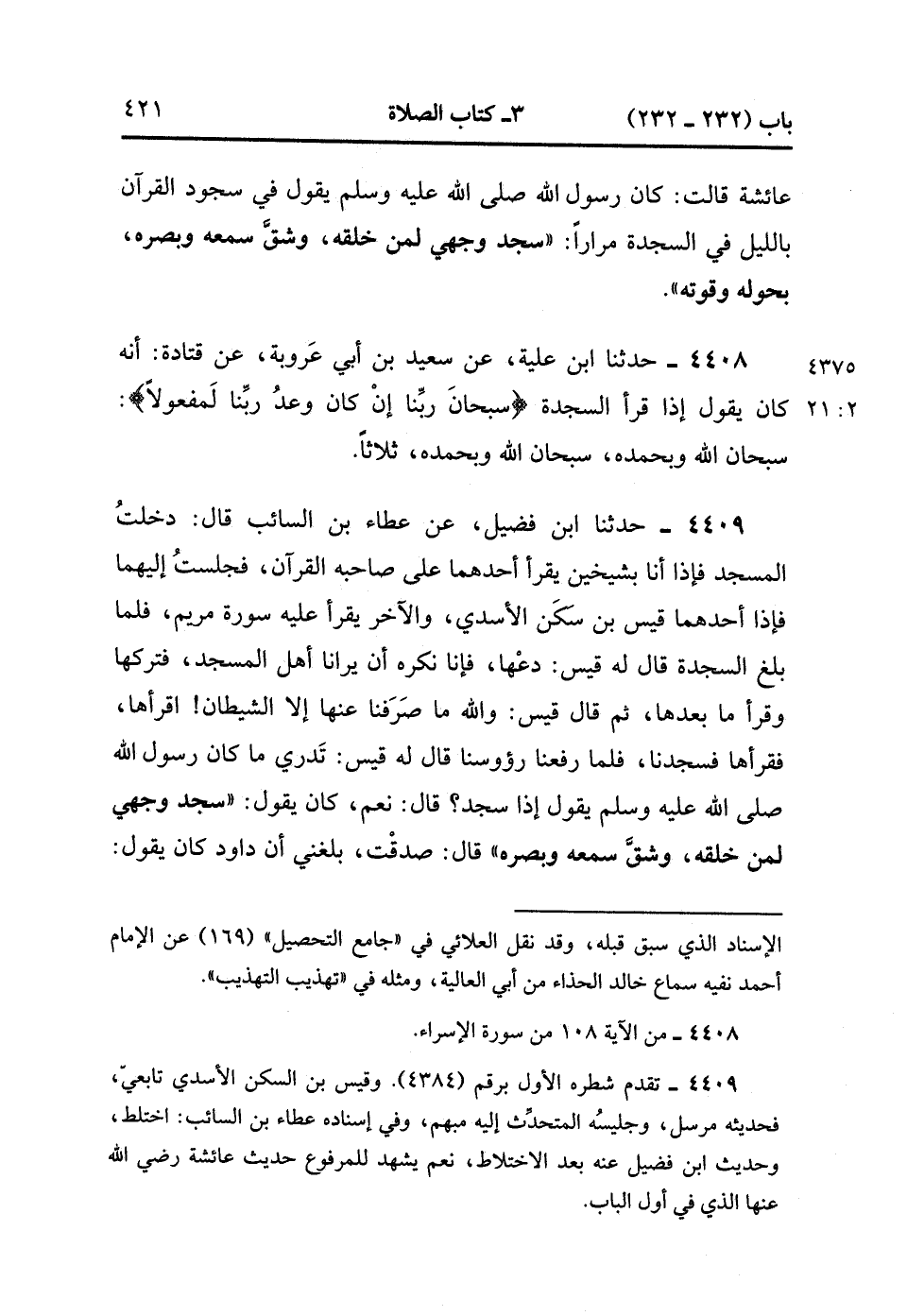 4409- حَدَّثَنَا ابْنُ فُضَيْلٍ ، عَنْ عَطَاءِ بْنِ السَّائِبِ ، قَالَ : دَخَلْتُ الْمَسْجِدَ فَإِذَا أَنَا بِشَيْخَيْنِ يَقْرَأُ أَحَدُهُمَا عَلَى صَاحِبِهِ الْقُرْآنَ ، فَجَلَسْتُ إلَيْهِمَا فَإِذَا أَحَدُهُمَا قَيْسُ بْنُ سَكَنِ الأَسَدِيُّ ، وَالآخَرُ يَقْرَأُ عَلَيْهِ سُورَةَ مَرْيَمَ ، فَلَمَّا بَلَغَ السَّجْدَةَ ، قَالَ لَهُ قَيْسٌ : دَعْهَا ، فَإِنَّا نَكْرَهُ أَنْ يَرَانَا أَهْلُ الْمَسْجِدِ ، فَتَرَكَهَا وَقَرَأَ مَا بَعْدَهَا ، ثُمَّ قَالَ قيْسٌ : وَاللَّهِ مَا صَرَفَنَا عَنْهَا إِلاَّ الشَّيْطَانُ ، اقْرَأْهَا ، فَقَرَأَهَا فَسَجَدْنَا ، فَلَمَّا رَفَعْنَا رُؤُوسَنَا ، قَالَ لَهُ قَيْسٌ : تَدْرِي مَا كَانَ رَسُولُ اللهِ صَلَّى الله عَلَيْهِ وَسَلَّمَ يَقُولُ إذَا سَجَدَ ؟ قَالَ : نَعَمْ ، كَانَ يَقُولُ : سَجَدَ وَجْهِي لِمَنْ خَلَقَهُ ، وَشَقَّ سَمْعَهُ وَبَصَرَهُ ، قَالَ : صَدَقْت ، بَلَغَنِي أَنَّ دَاوُد كَانَ يَقُولُ : سَجَدَ وَجْهِي مُتَعَفِّرًا فِي التُّرَابِ لِخَالِقِي وَحُقَّ لَهُ ، ثُمَّ قَالَ : سُبْحَانَ اللهِ ! مَا أَشْبَهَ كَلاَمَ الأَنْبِيَاءِ بَعْضِهِم بِبَعض. (2/21).