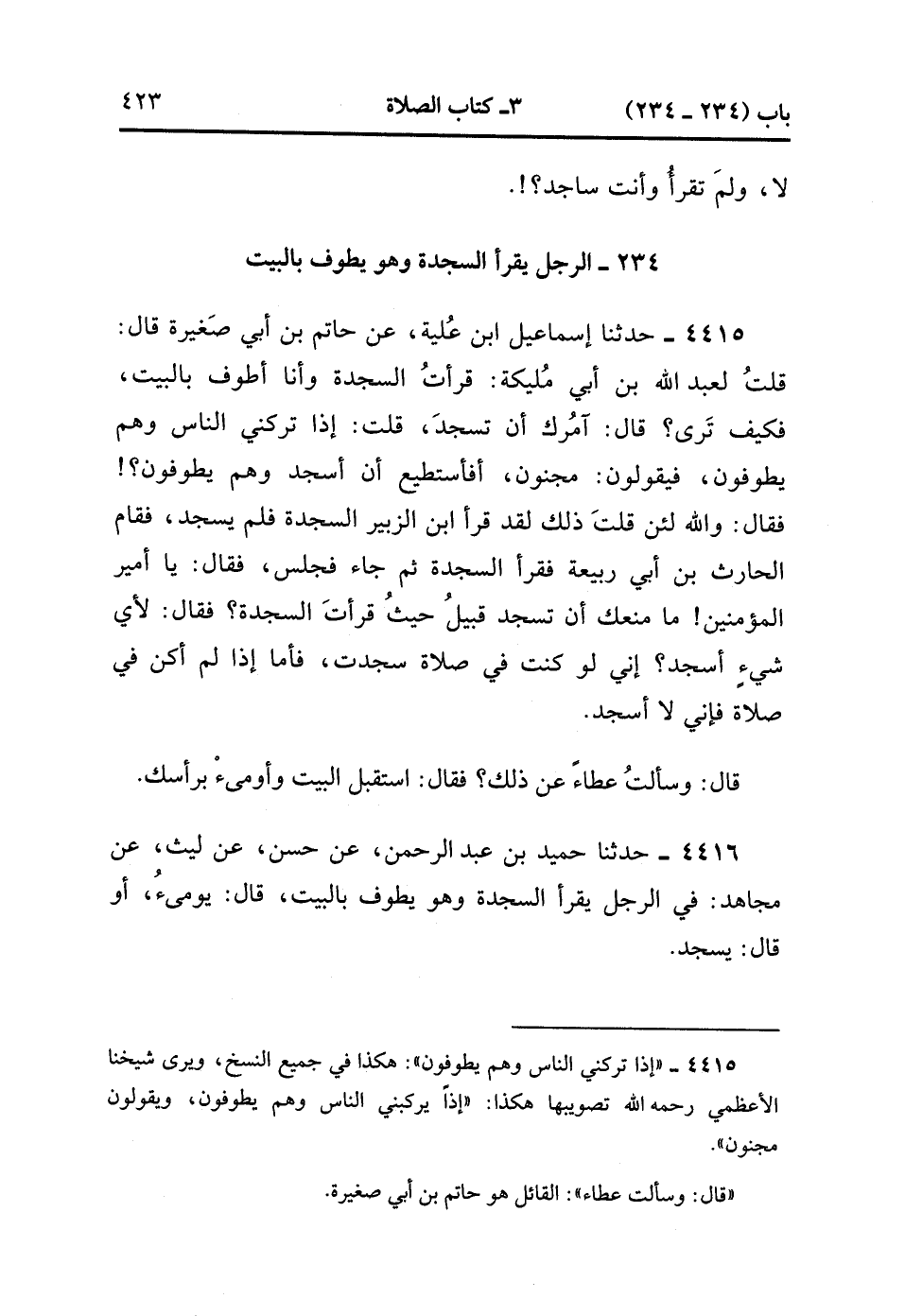 4415- حَدَّثَنَا إسْمَاعِيلُ ابْنُ عُلَيَّةَ ، عَنْ حَاتِمِ بْنِ أَبِي صَغِيرَةَ ، قَالَ : قُلْتُ لِعَبْدِ اللهِ بْنِ أَبِي مُلَيْكَةَ : قَرَأْتُ السَّجْدَةَ وَأَنَا أَطُوفُ بِالْبَيْتِ فَكَيْفَ تَرَى ؟ قَالَ : آمُرُك أَنْ تَسْجُدَ ، قُلْتُ : إذَا تَرَكَنِي النَّاسُ وَهُمْ يَطُوفُونَ ، فَيَقُولُونَ : مَجْنُونٌ ، أَفَأَسْتَطِيعُ أَنْ أَسْجُدَ وَهُمْ يَطُوفُونَ ؟ فَقَالَ : وَاللَّهِ لَئِنْ قُلْتَ ذَلِكَ لَقَدْ قَرَأَ ابْنُ الزُّبَيْرِ السَّجْدَةَ فَلَمْ يَسْجُدْ ، فَقَامَ الْحَارِثُ بْنُ أَبِي رَبِيعَةَ فَقَرَأَ السَّجْدَةَ ثُمَّ جَاءَ فَجَلَسَ ، فَقَالَ : يَا أَمِيرَ الْمُؤْمِنِينَ ، مَا مَنَعَك أَنْ تَسْجُدَ قُبَيْلُ حَيْثُ قَرَأْتَ السَّجْدَةَ ؟ فَقَالَ : لأَيِّ شَيْءٍ أَسْجُدُ ؟ إنِّي لَوْ كُنْت فِي صَلاَةٍ سَجَدْت ، فَأَمَّا إذَا لَمْ أَكُنْ فِي صَلاَةٍ فَإِنِّي لا أَسْجُدُ.