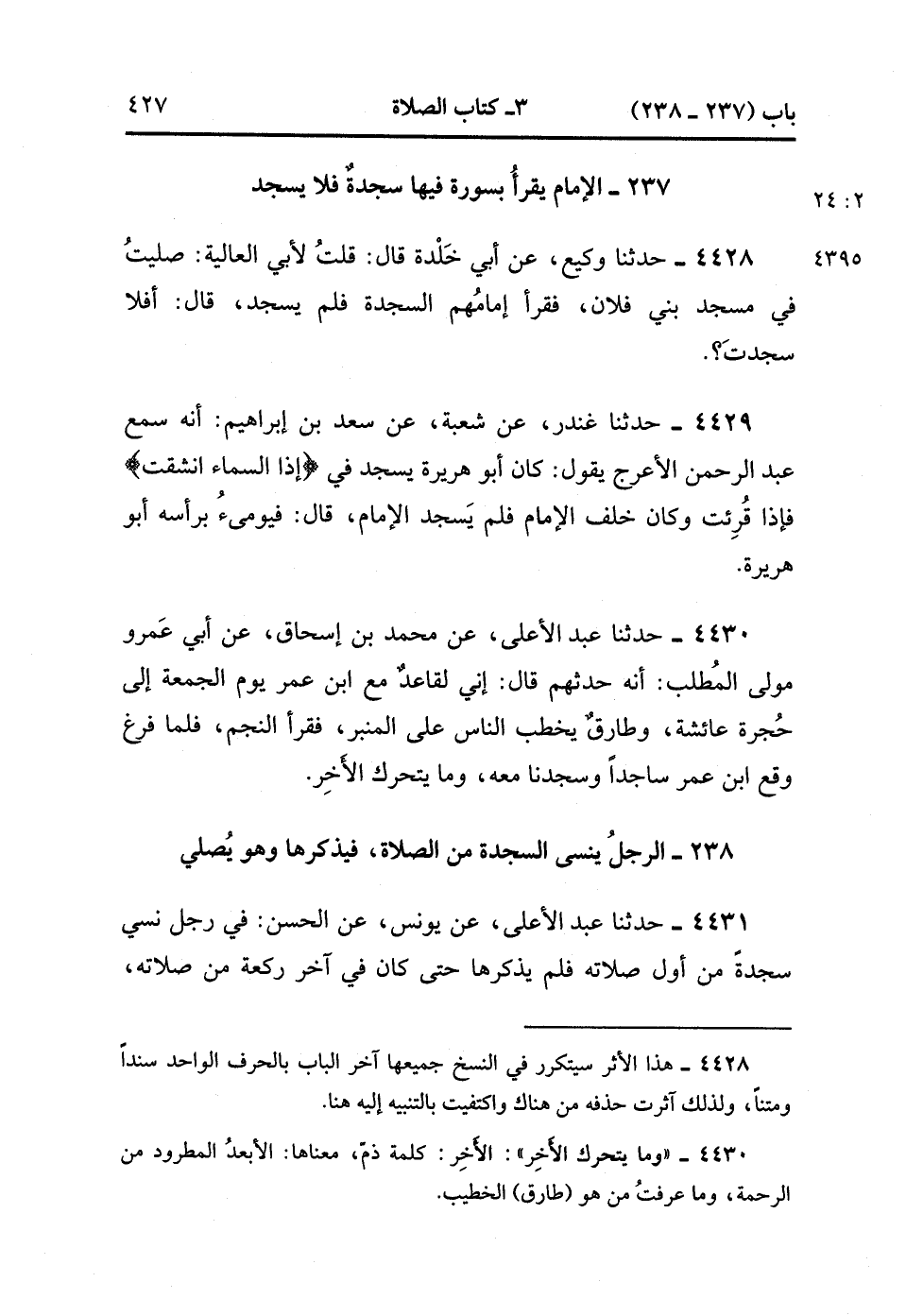 237- الإمام يقرأ بِسُورَةٍ فِيهَا سَجْدَةٌ فَلاَ يَسْجُدُ.