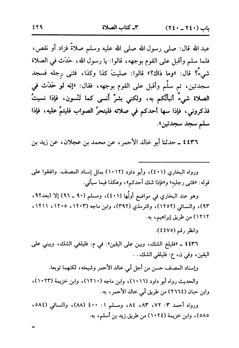 4436- حَدَّثَنَا أَبُو خَالِدٍ الأَحْمَرِِ ، عَنْ مُحَمَّدِ بْنِ عَجْلاَنَ ، عَنْ زَيْدِ بْنِ أَسْلَمَ ، عْن عَطَاءِ بْنِ يَسَارٍ ، عَنْ أَبِي سَعِيدٍ الْخُدْرِيِّ ، قَالَ : قالَ رَسُولُ اللهِ صلى الله عليه وسلم : إذَا شَكَّ أَحَدُكُمْ فِي صَلاَتِهِ فَلْيُلْغ الشَّكَّ ، وَيَبْنِ عَلَى الْيَقِينِ ، فَإِذَا اسْتَيْقَنَ التَّمَامَ رَكَعَ رَكْعَةً وَسَجَدَ سَجْدَتَيْنِ ، فَإِنْ كَانَتْ صَلاَتُهُ تَامَّةً ، كَانَتَ الرَّكْعَةُ وَالسَّجْدَتَانِ نَافِلَةً ، وَإِنْ كَانَتْ نَاقِصَةً كَانَتَ الرَّكْعَةُ تَمَامَ صَلاَتِهِ ، وَالسَّجْدَتَانِ يُرْغِمَانِ الشَّيْطَانَ.