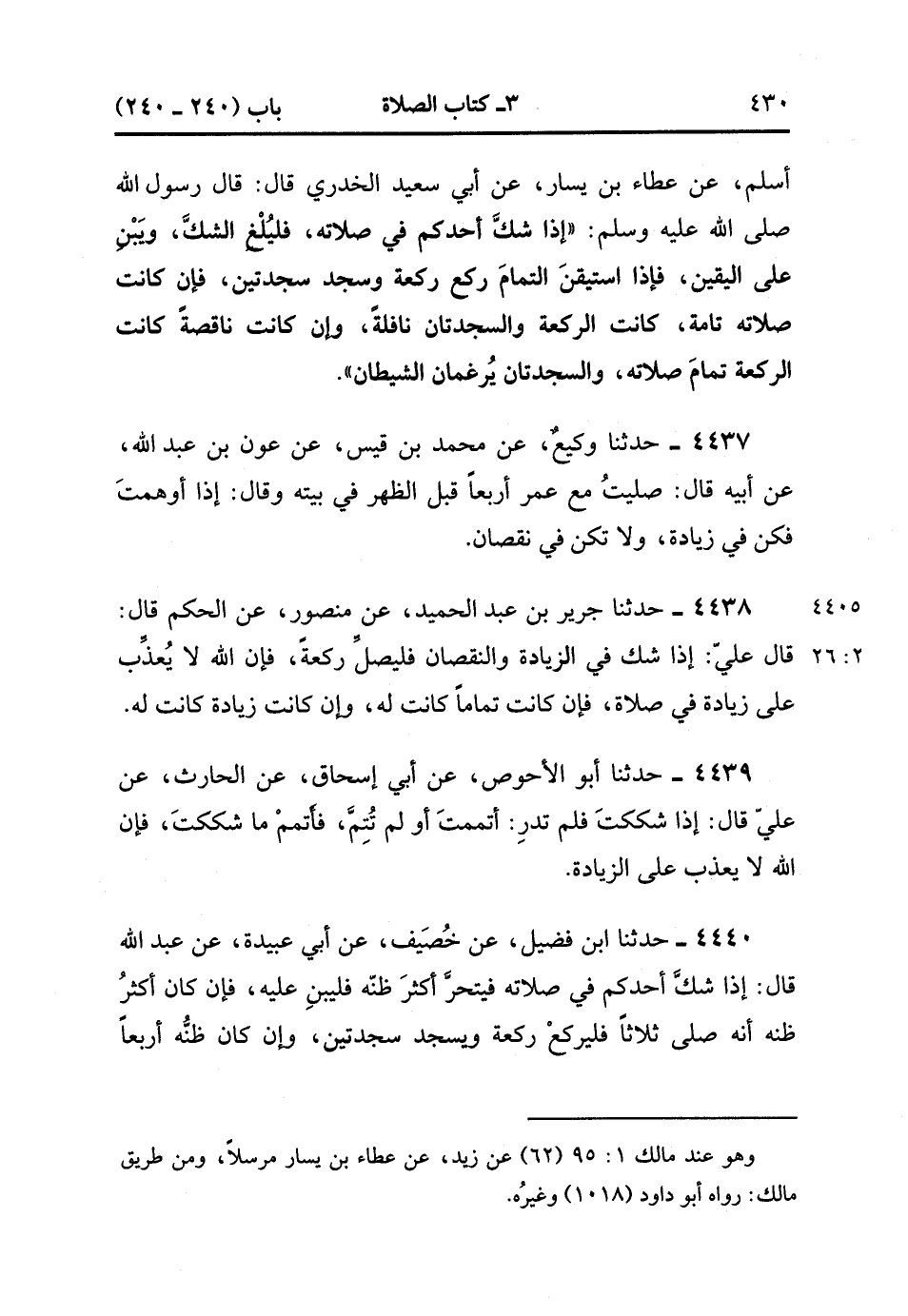 4438- حَدَّثَنَا جَرِيرٌ بنْ عَبْدِ الْحَمِيدِ ، عَنْ مَنْصُورٍ ، عَنِ الْحَكَمِ ، قَالَ : قَالَ عَلِيٌّ : إذَا شَكَّ فِي الزِّيَادَةِ وَالنُّقْصَانِ فَلْيُصَلِّ رَكْعَةً ، فَإِنَّ اللَّهَ لا يُعَذِّبُ عَلَى زِيَادَةٍ فِي صَّلاَة ، فَإِنْ كَانَتْ تَمَامًا كَانَتْ لَهُ ، وَإِنْ كَانَتْ زِيَادَةً كَانَتْ لَهُ. (2/25)
