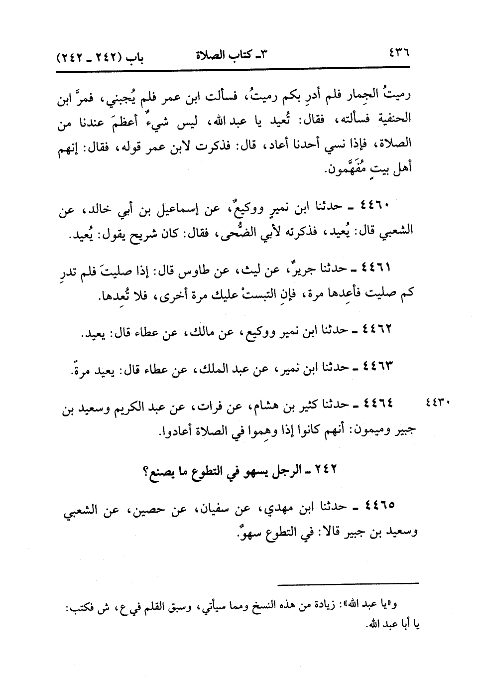 4465- حَدَّثَنَا ابْنُ مَهْدِيٍّ ، عَنْ سُفْيَانَ ، عَنْ حُصَيْنٍ ، عَنِ الشَّعْبِيِّ وَسَعِيدِ بْنِ جُبَيْرٍ ، قَالاَ : فِي التَّطَوُّعِ سَهْوٌ. (2/28).