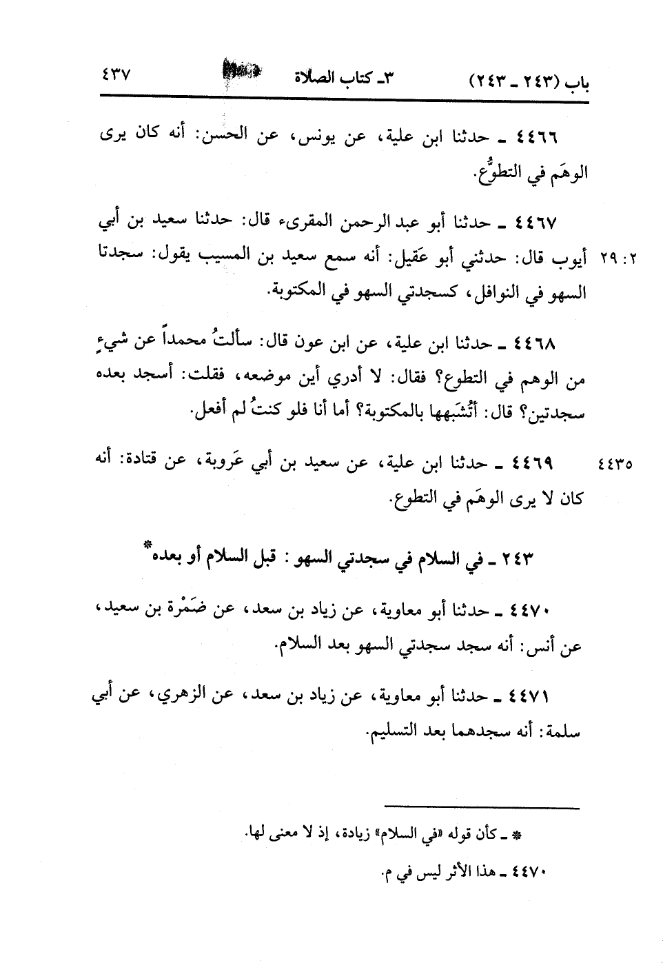 4467- حَدَّثَنَا أَبُو عَبْدِ الرَّحْمَنِ الْمُقْرِىء , قَالَ : حدَّثَنَا سَعِيدُ بْنُ أَبِي أَيُّوبَ ، قَالَ : حَدَّثَنِي أَبُو عَقِيلٍ ؛ أَنَّهُ سَمِعَ سَعِيدَ بْنَ الْمُسَيَّبِ يَقُولُ : سَجْدَتَا السَّهْوِ فِي النَّوَافِلِ ، كَسَجْدَتَيَ السَّهْوِ فِي الْمَكْتُوبَةِ. (2/28)