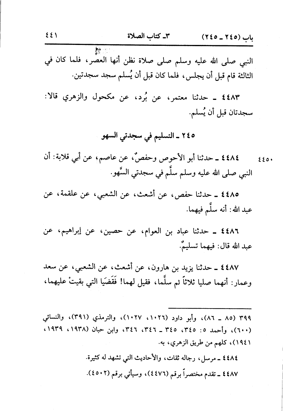 4484- حَدَّثَنَا أَبُو الأَحْوَصِ وَحَفْصٌ ، عَنْ عَاصِمٍ ، عَنْ أَبِي قِلاَبَةَ : أَنَّ النَّبِيَّ صَلَّى الله عَلَيْهِ وَسَلَّمَ سَلَّمَ فِي سَجْدَتَي السَّهْوِ.