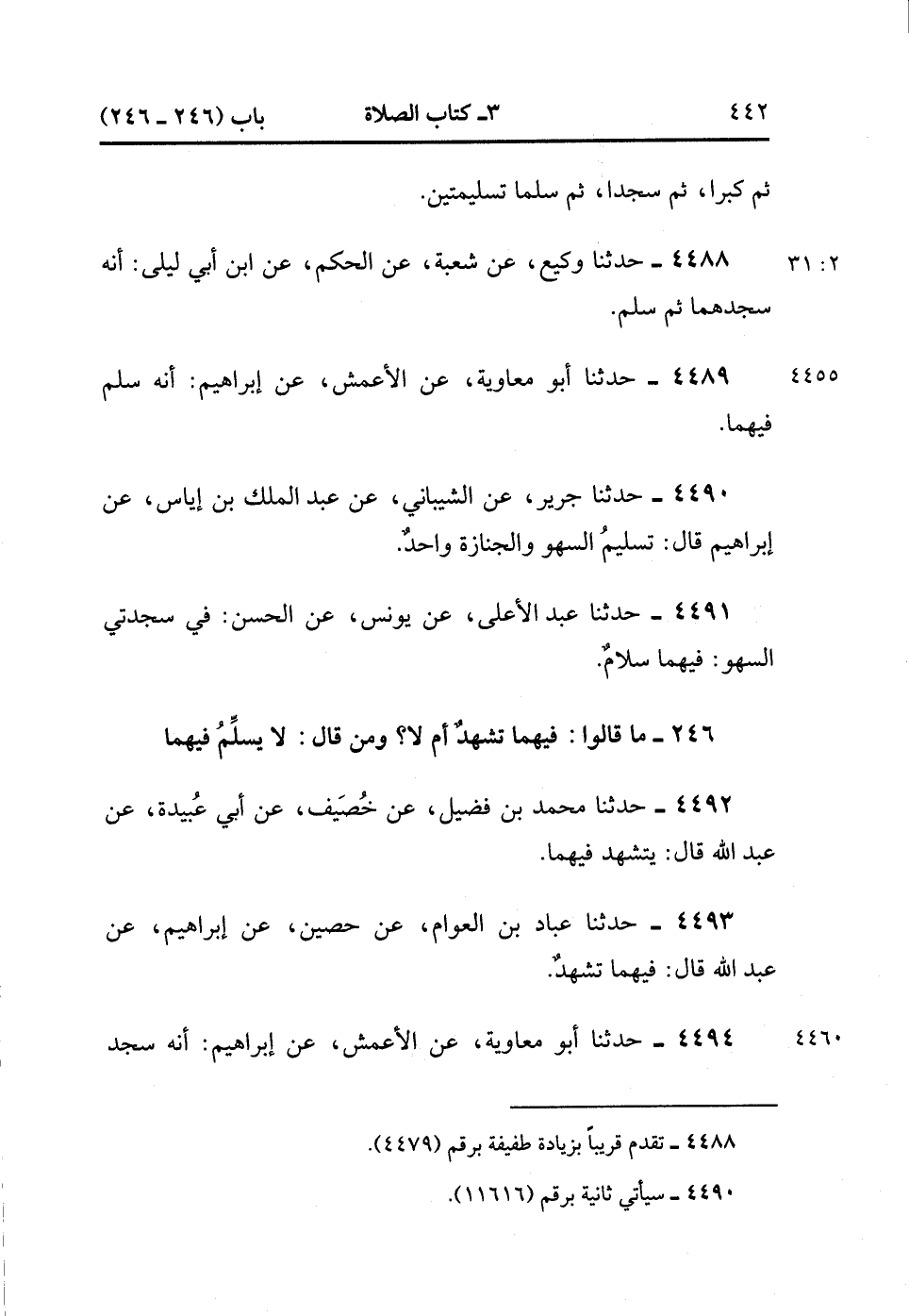 4494- حَدَّثَنَا أَبُو مُعَاوِيَةَ ، عَنِ الأَعْمَشِ ، عَنْ إبْرَاهِيمَ : أَنَّهُ سَجَدَ سَجْدَتَي السَّهْوِ فَتَشَهَّدَ فِيهِمَا ثُمَّ سَلَّمَ. (2/31).