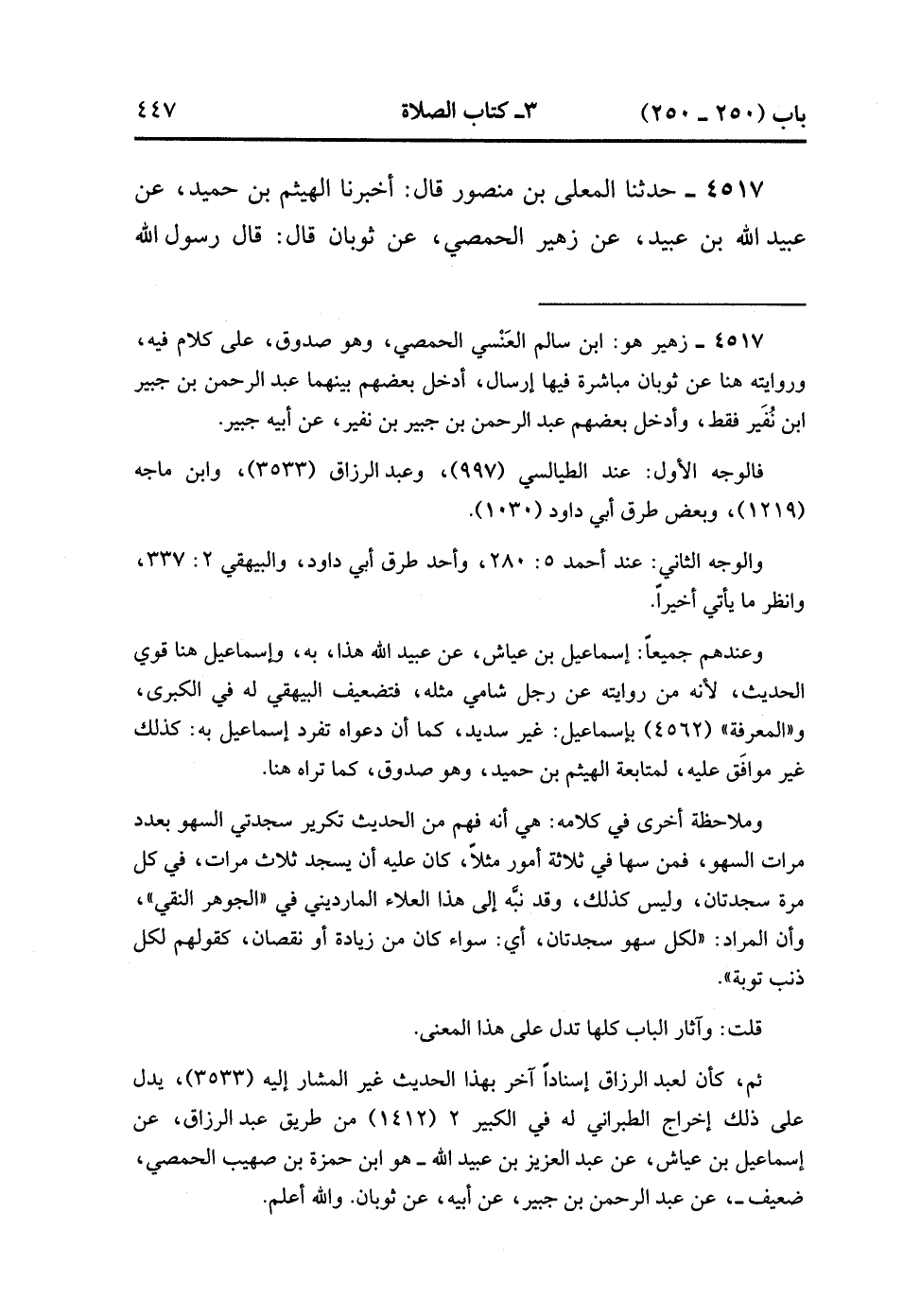 4517- حَدَّثَنَا الْمُعَلَّى بْنُ مَنْصُورٍ , قَالَ : أَخْبَرَنَا الْهَيْثُمَّ بْنُ حُمَيْدٍ ، عَنْ عُبَيْدِ اللهِ بْنِ عُبَيْدٍ ، عَنْ زُهَيْرٍ الْحِمْصِيِّ ، عَنْ ثَوْبَانَ ، قَالَ : قَالَ رَسُولُ اللهِ صَلَّى الله عَلَيْهِ وَسَلَّمَ : لِكُلِّ سَهْوٍ سَجْدَتَانِ. (2/33).
