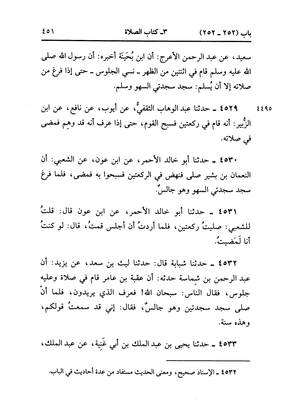 4531- حَدَّثَنَا أَبُو خَالِدٍ الأَحْمَرِِ ، عَنِ ابْنِ عَوْنٍ ، قَالَ : قُلْتُ لِلشَّعْبِيِّ : صَلَّيْتُ رَكْعَتَيْنِ فَلَمَّا أَرَدْتُ أَنْ أَجْلِسَ قُمْتُ ، قَالَ : لَوْ كُنْتُ أَنَا لَمَضَيْتُ.