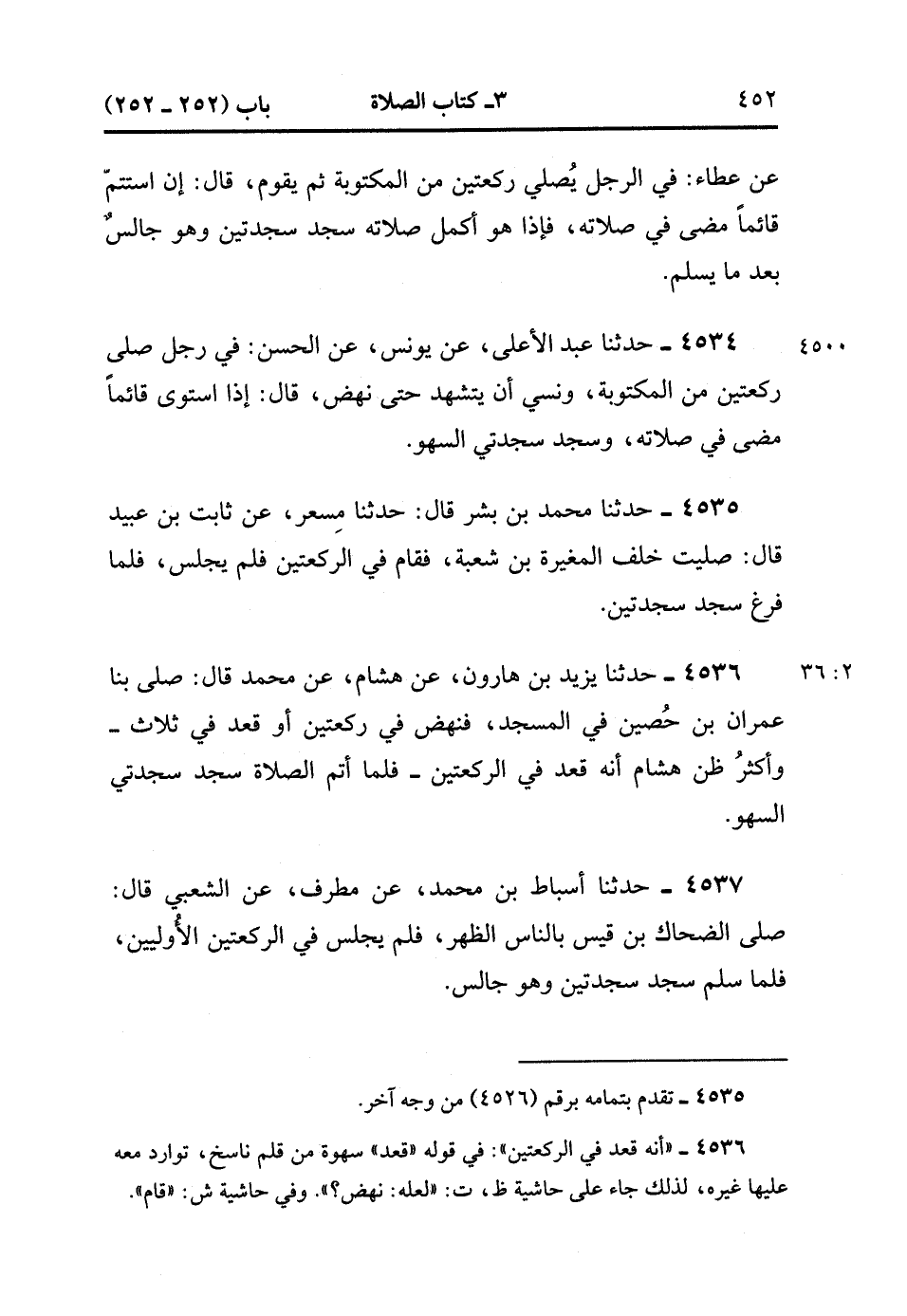4535- حَدَّثَنَا مُحَمَّدُ بْنُ بِشْرٍ , قَالَ : حدَّثَنَا مِسْعَرٌ ، عَنْ ثَابِتِ بْنِ عُبَيْدٍ ، قَالَ : صَلَّيْت خَلْفَ الْمُغِيرَةِ بْنِ شُعْبَةَ ، فَقَامَ فِي الرَّكْعَتَيْنِ فَلَمْ يَجْلِسْ ، فَلَمَّا فَرَغَ سَجَدَ سَجْدَتَيْنِ. (2/35)