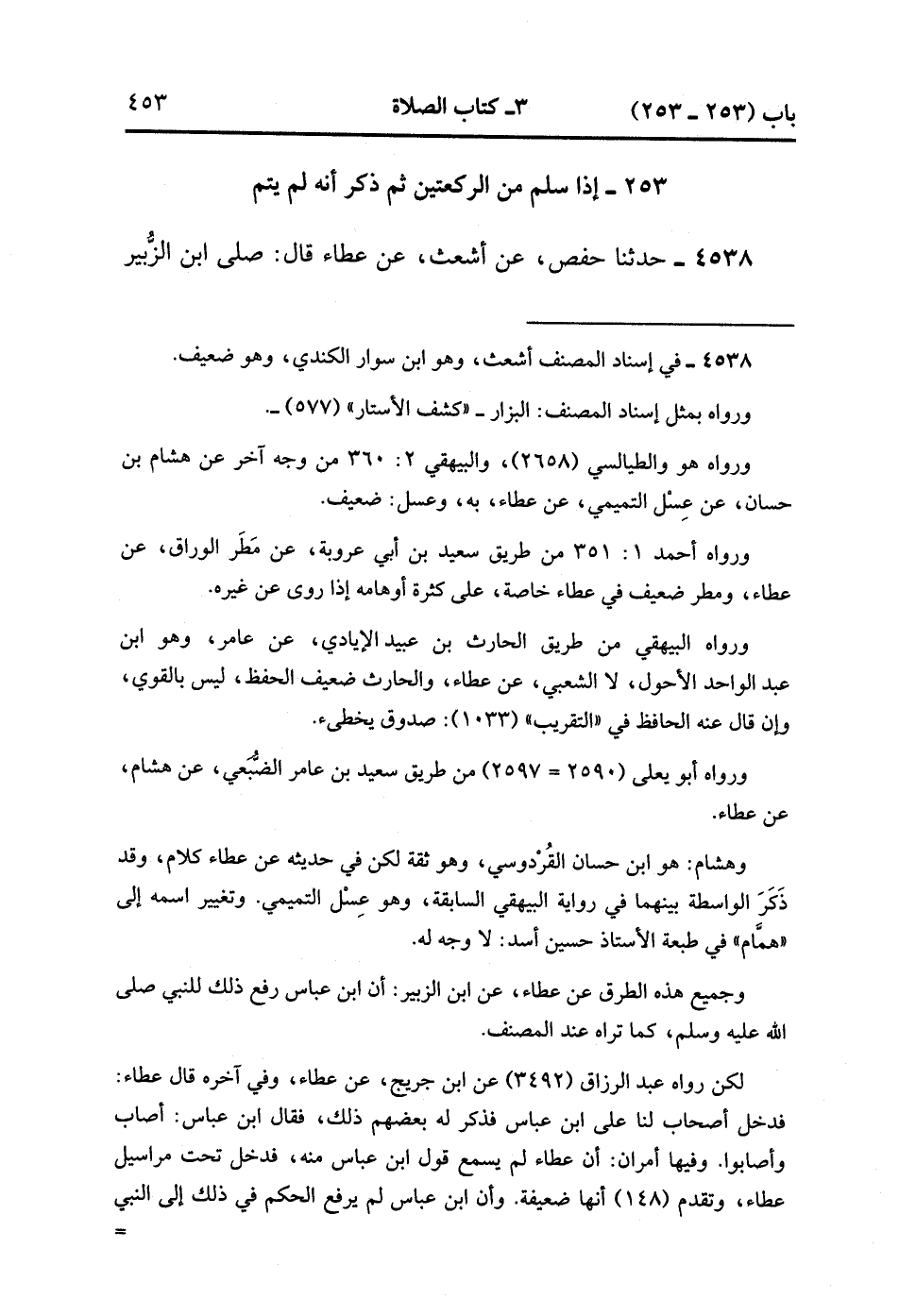 4538- حَدَّثَنَا حَفْصٌ ، عَنْ أَشْعَثَ ، عَنْ عَطَاءٍ ، قَالَ : صَلَّى ابْنُ الزُّبَيْرِ فَسَلَّمَ فِي رَكْعَتَيْنِ ، ثُمَّ قَامَ إلَى الْحَجَرِ فَاسْتَلَمَهُ ، فَسَبَّحَ بِهِ الْقَوْمُ ، فَرَجَعَ فَأَتَمَّ وَسَجَدَ سَجْدَتَيْنِ ، قَالَ : فَذَكَرْتُ ذَلِكَ لابْنِ عَبَّاسٍ ، فَقَالَ : لِلَّهِ أَبُوهُ ، مَا أَمَاطَ عَنْ سُنَّةِ نَبِيِّهِ. (2/36).