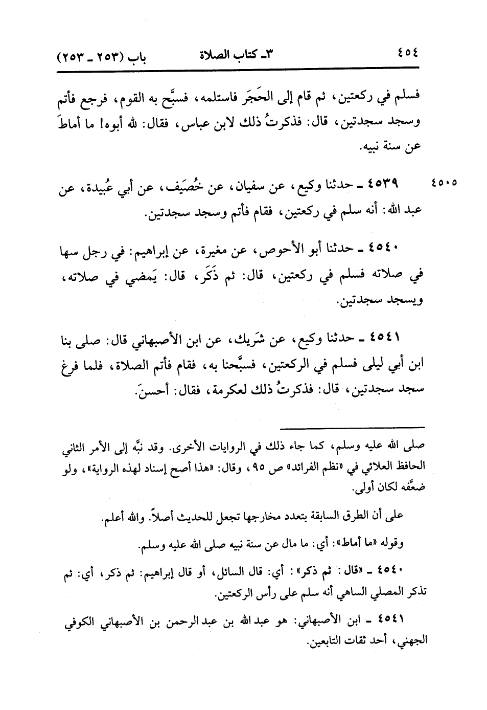 4539- حَدَّثَنَا وَكِيعٌ ، عَنْ سُفْيَانَ ، عَنْ خُصَيْفٍ ، عَنْ أَبِي عُبَيْدَةَ ، عَنْ عَبْدِ اللهِ : أَنَّهُ سَلَّمَ فِي رَكْعَتَيْنِ فَقَامَ فَأَتَمَّ وَسَجَدَ سَجْدَتَيْنِ.