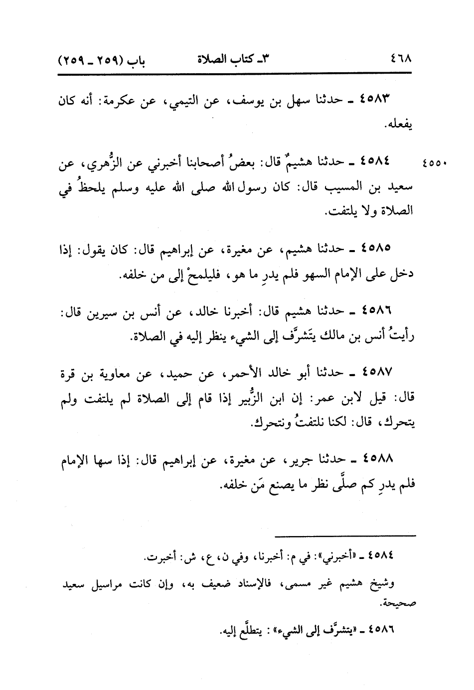 4584- حَدَّثَنَا هُشَيْمٌ ، قَالَ : بَعْضُ أَصْحَابِنَا أَخْبَرَنِي عَنِ الزُّهْرِيِّ ، عَنْ سَعِيدِ بْنِ الْمُسَيَّبِ ، قَالَ : كَانَ رَسُولُ اللهِ صَلَّى الله عَلَيْهِ وَسَلَّمَ يَلْحَظُ فِي الصَّلاَة وَلا يَلْتَفِتُ.