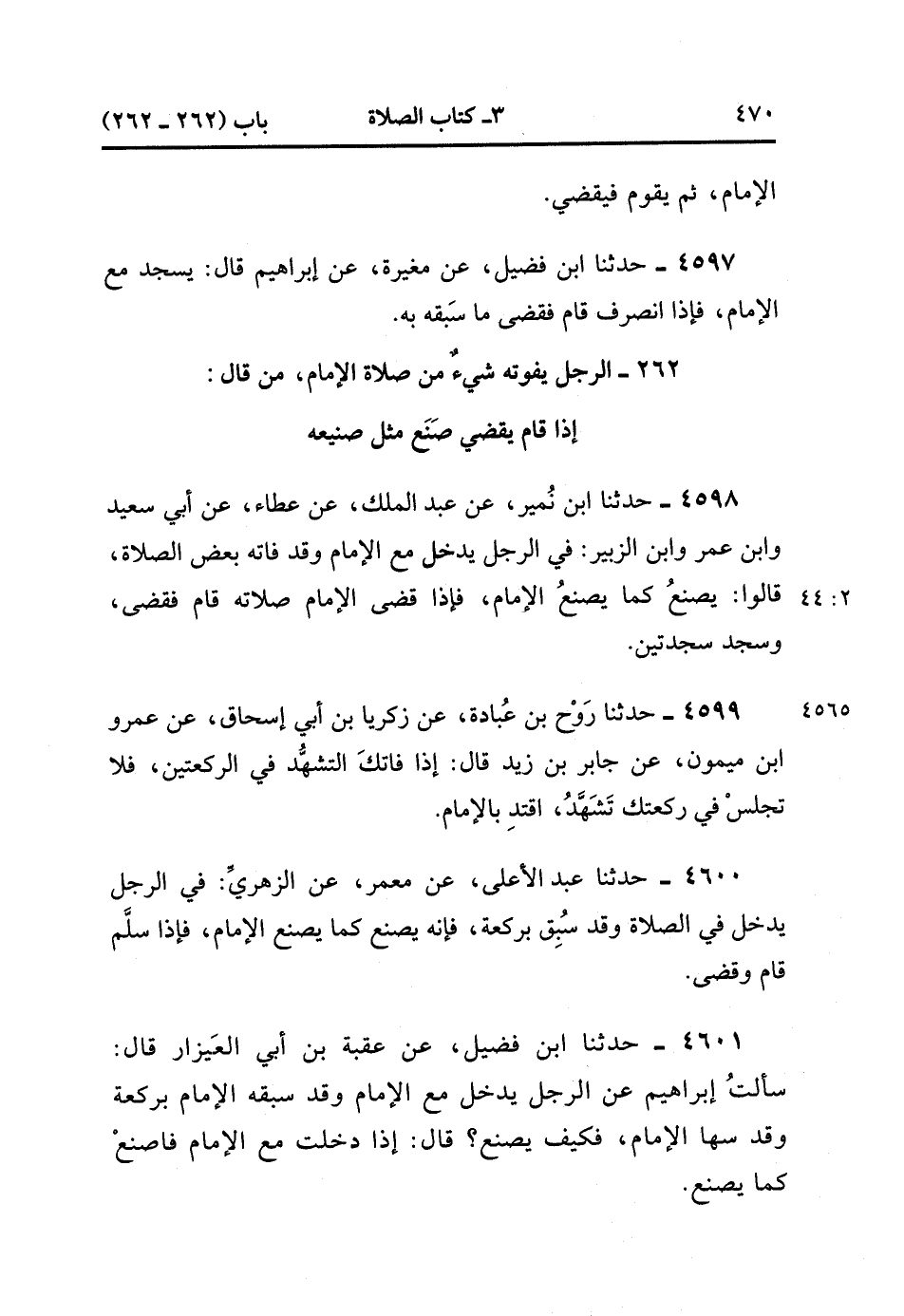 262- الرَّجُلُ يَفُوتُهُ شَيْءٌ مِنْ صَلاَةِ الإِمَامِ ، مَنْ قَالَ : إِذَا قَامَ يَقْضِي صَنَعَ مِثْلَ صَنِيعِهِ