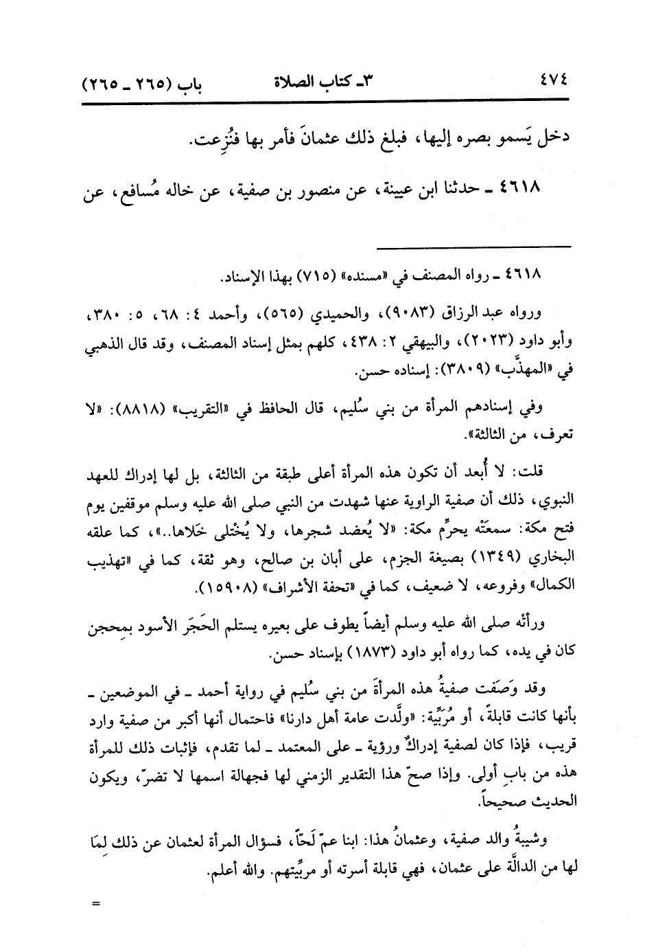 4618- حَدَّثَنَا ابْنُ عُيَيْنَةَ ، عَنْ مَنْصُورِ ابْنِ صَفِيَّةَ ، عَنْ خَالَهِ مُسَافِعٍ ، عَنْ أُخْتِهِ صَفِيَّةَ أُمِّ مَنْصُورٍ ، قَالَتْ : أَخْبَرَتْنِي امْرَأَةٌ مِنْ أَهْلِ الدَّارِ مِنْ بَنِي سُلَيْمٍ ، قَالَتْ : قُلْتُ لِعُثْمَانَ بْنِ طَلْحَةَ : لِمَ دَعَاك رَسُولُ اللهِ صَلَّى الله عَلَيْهِ وَسَلَّمَ حِينَ خَرَجَ مِنَ الْبَيْتِ ؟ قَالَ : قَالَ : إنِّي رَأَيْتُ قَرْنَي الْكَبْشِ فَنَسِيتُ أَنْ آمُرَك أَنْ تُخَمِّرَهُمَا ، وَإِنَّهُ لا يَنْبَغِي أَنْ يَكُونَ فِي الْبَيْتِ شَيْءٌ يَشْغَلُ الْمُصَلِّيَ. (2/46).