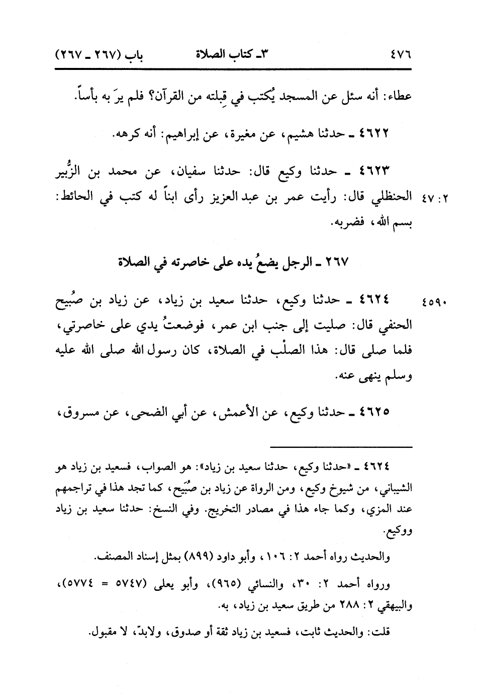 4624- حَدَّثَنَا وَكِيعٌ ، حَدَّثَنَا سَعِيدُ بْنُ زِيَادٍ ، عَنْ زِيَادِ بْنِ صُبَيْحِ الْحَنَفِيِّ ، قَالَ : صَلَّيْت إلَى جَنْبِ ابْنِ عُمَرَ فَوَضَعْتُ يَدِي عَلَى خَاصِرَتِي ، فَلَمَّا صَلَّى ، قَالَ : هَذَا الصُّلْبُ فِي الصَّلاَة ، كَانَ رَسُولُ اللهِ صَلَّى الله عَلَيْهِ وَسَلَّمَ يَنْهَى عَنْهُ.