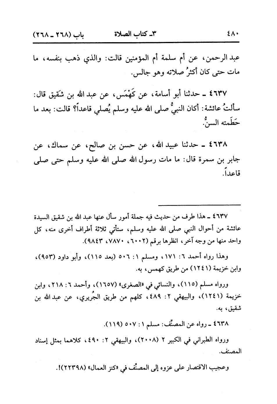 4637- حَدَّثَنَا أَبُو أُسَامَةَ ، عَنْ كَهْمَسٍ ، عَنْ عَبْدِ اللهِ بْنِ شَقِيقٍ ، قَالَ : سَأَلْتُ عَائِشَةَ : أَكَانَ النَّبِيُّ صَلَّى الله عَلَيْهِ وَسَلَّمَ يُصَلِّي قَاعِدًا ؟ قَالَتْ : بَعْدَ مَا حَطَّمَتْهُ السِّنُّ.